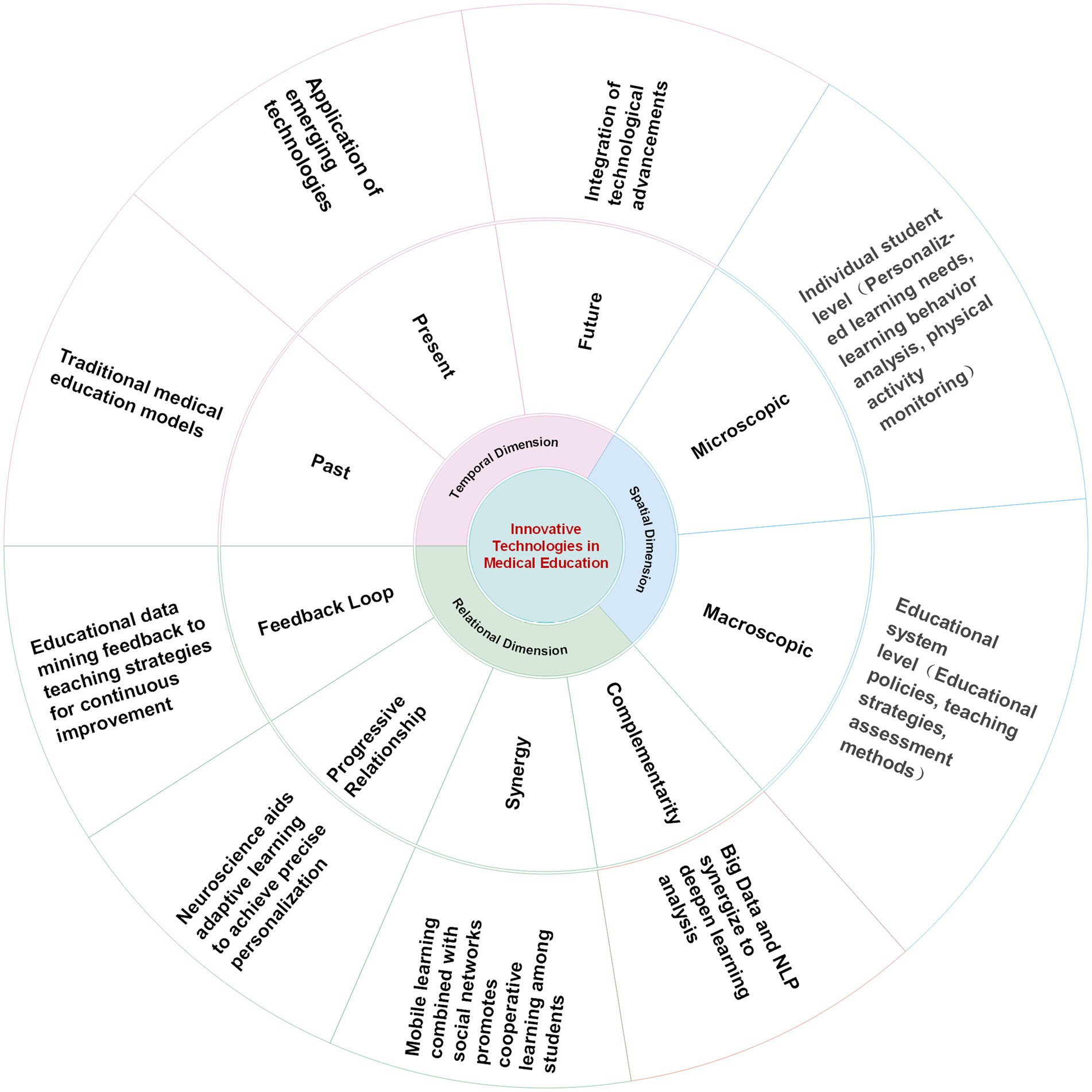 Our multidimensional analysis has revealed the comprehensive impact of technological innovation on medical education, spanning from historical teaching paradigms to future trends, and from individual student needs to broader educational policies. The relational dimension of our analysis has highlighted the synergies among different technologies, which are crucial for the progressive optimization of educational strategies. This analysis not only deepens our understanding of technological transformations in medical education but also offers new perspectives and strategies for innovative practices in the field (Figure 3).