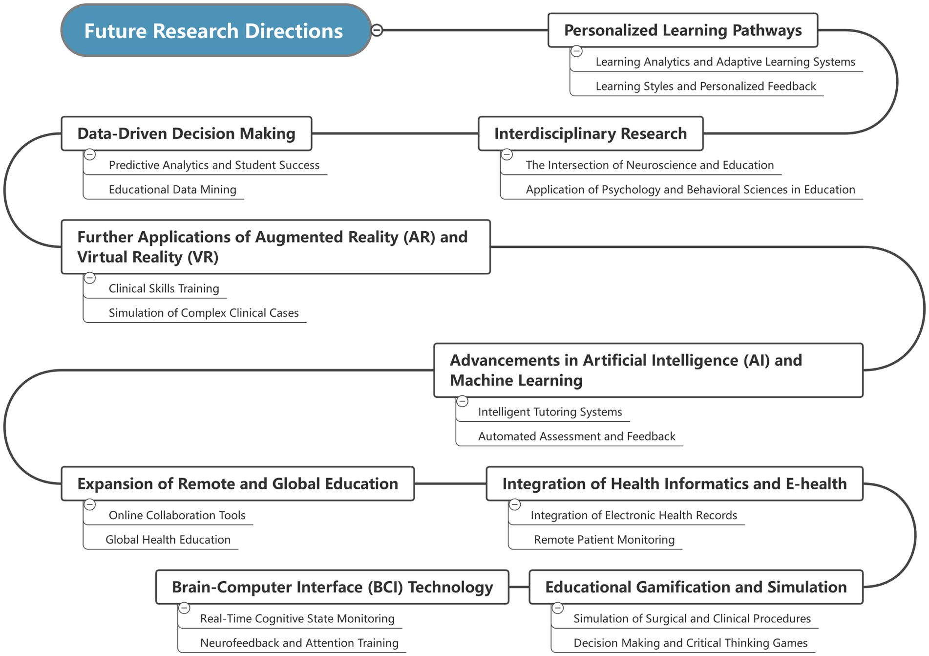 With the convergence of artificial intelligence and machine learning, intelligent teaching systems will be able to monitor students’ learning progress in real-time and provide feedback. Policymakers must balance the advantages of technology with potential risks, ensuring that technological applications genuinely enhance educational quality. Continuous research and practice will aid in discovering more effective evaluation methods, optimizing educational strategies, and cultivating professional talents to meet future medical needs. Notably, the development of brain-computer interface (BCI) technology will offer a new perspective in medical education, providing real-time feedback on students’ cognitive states to educators, optimizing teaching strategies, and improving learning efficiency (Wan et al., 2024). As technology advances, medical education is poised to become more personalized, efficient, and innovative.