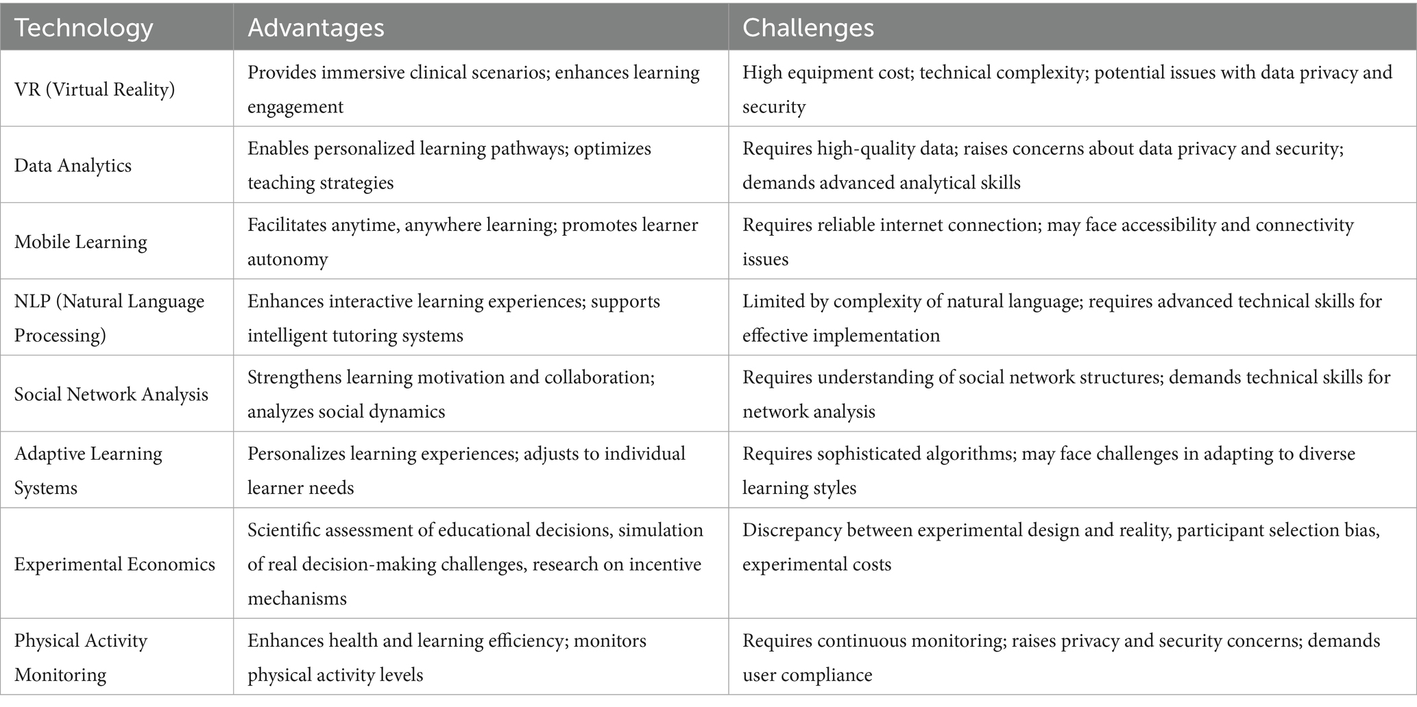 In assessing the impact of these technologies, we have identified both their advantages and challenges (Table 1). While each technology has the potential to modernize medical education, they also present challenges related to data quality, privacy protection, and technological adaptability. Therefore, it is imperative for educators and policymakers to address these challenges seriously to ensure the enhancement of educational quality.