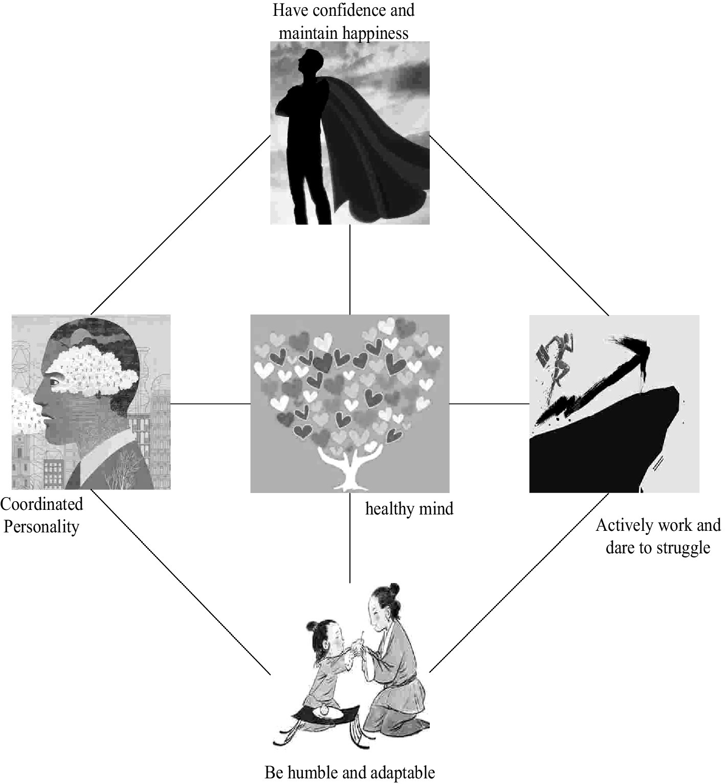 The issue of mental health standards is as diverse as the concept of mental health itself. Experts and scholars at home and abroad have made different descriptions based on different social and cultural backgrounds, research positions, principles, and methods. There are great differences in the standards of mental health. According to the definition of the World Mental Health Association, the key standards include: (1) a personality with coordinated physical, emotional, ability, will, and behavior; (2) a sense of happiness and self-confidence; (3) a humble character and the ability to adapt to social environments; and (4) active participation in work and creativity, as shown in Figure 4.