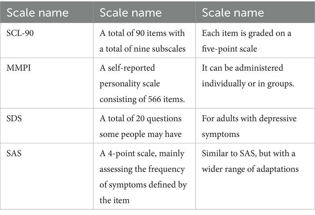 Pursuing and realizing mental health is the goal of human health. Different societies, different ethnic groups, and even different groups in the same society have different views on mental health. The research on mental health measurement in foreign countries is earlier than that in China, and the measurement methods for mental health are also varied, among which the most important and effective method is the mental health scale (Heijer et al., 2017; Kurebayashi and Otaki, 2018). Depending on the purpose of measurement, different scales are used, such as the SCL-90, the Eysenck Personality Questionnaire, the Self-Rating Health Scale, the MMPI, the SAS, the SDS, and the LES, as shown in Table 1.