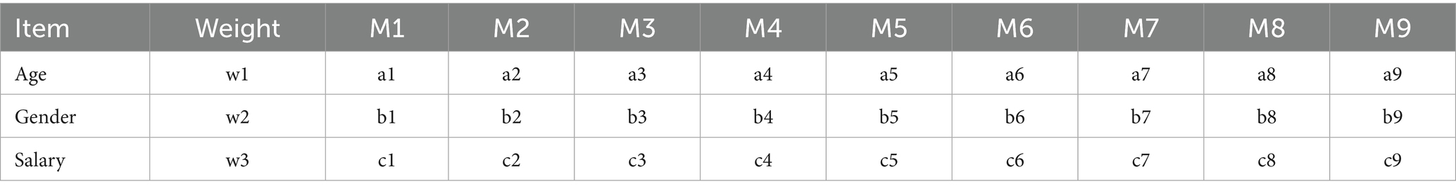 For the given evaluation index weights in this paper, it can be obtained according to the expert scoring method, as shown in Equation 13: