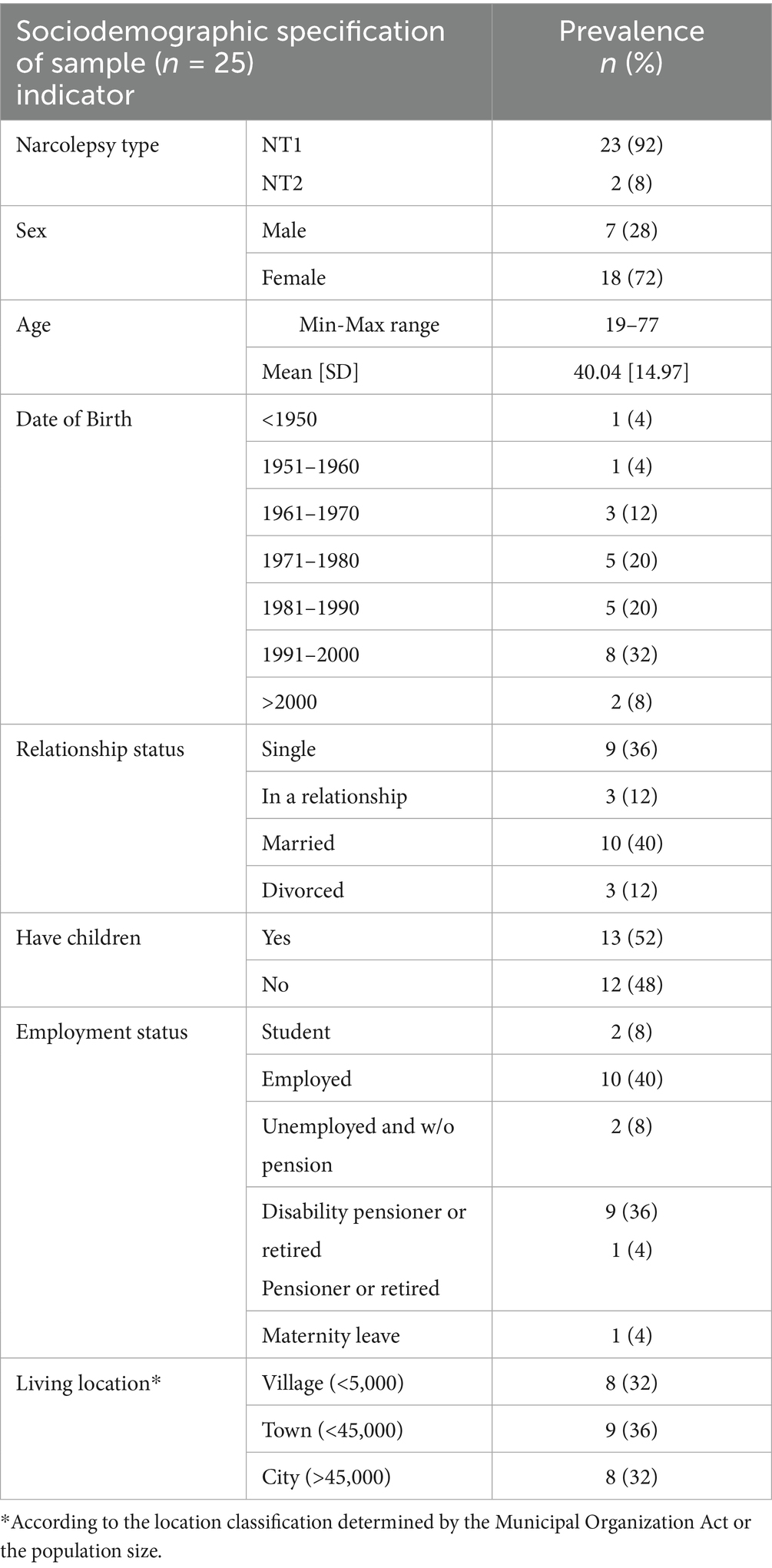 A total of 25 patients were interviewed and included in this study. Most of the participants were female (72%) and patients with NT1 (92%). This distribution reflects the national prevalence of narcolepsy subtypes in Slovakia, where approximately 84% of narcolepsy patients are diagnosed with NT1 (Feketeova et al., 2020). Most interviewees were young or middle-aged adults, with two 20-year-old patients and two elderly individuals also included. One participant had been diagnosed only a few days prior to the interview. The majority (96%) were Caucasian; one participant was a member of a minority. Eleven participants (44%) were drug-naïve at the time of an interview. The sample reflects the sociodemographic characteristics of the narcolepsy population in Slovakia (Feketeova et al., 2020). A detailed description of the sample is provided in Table 1.
