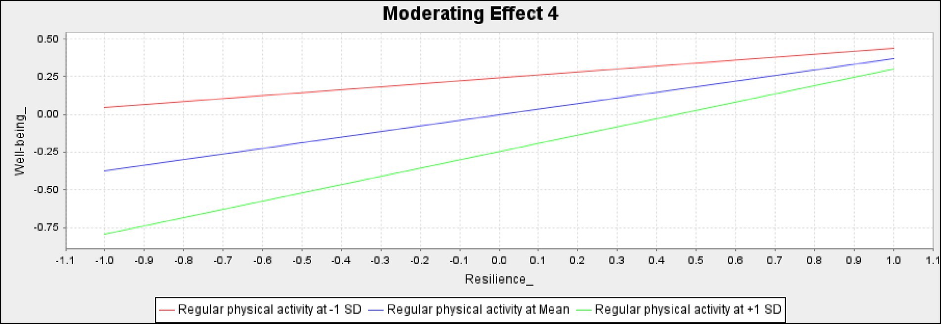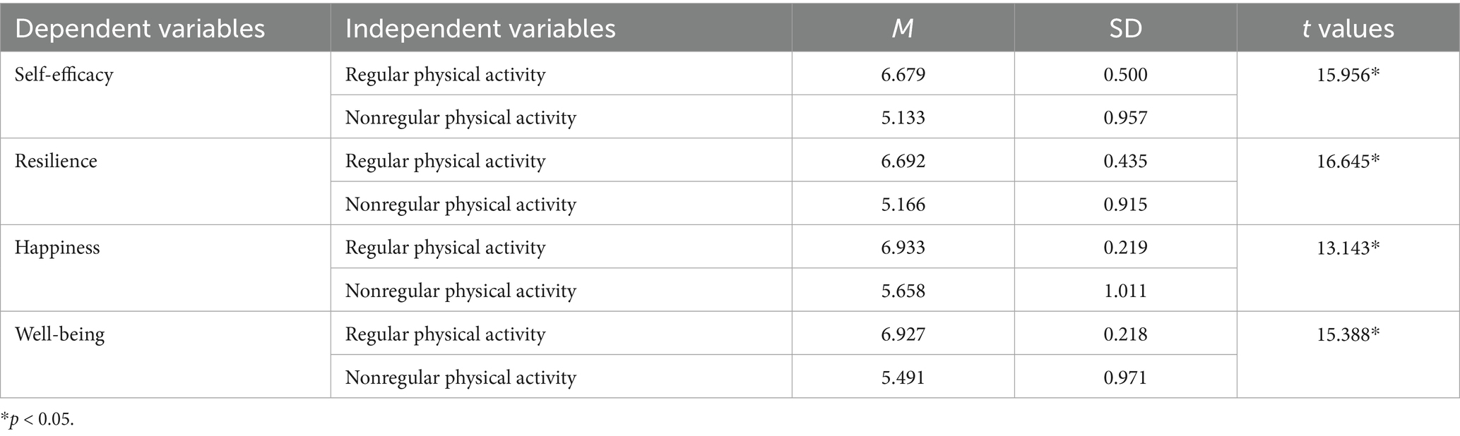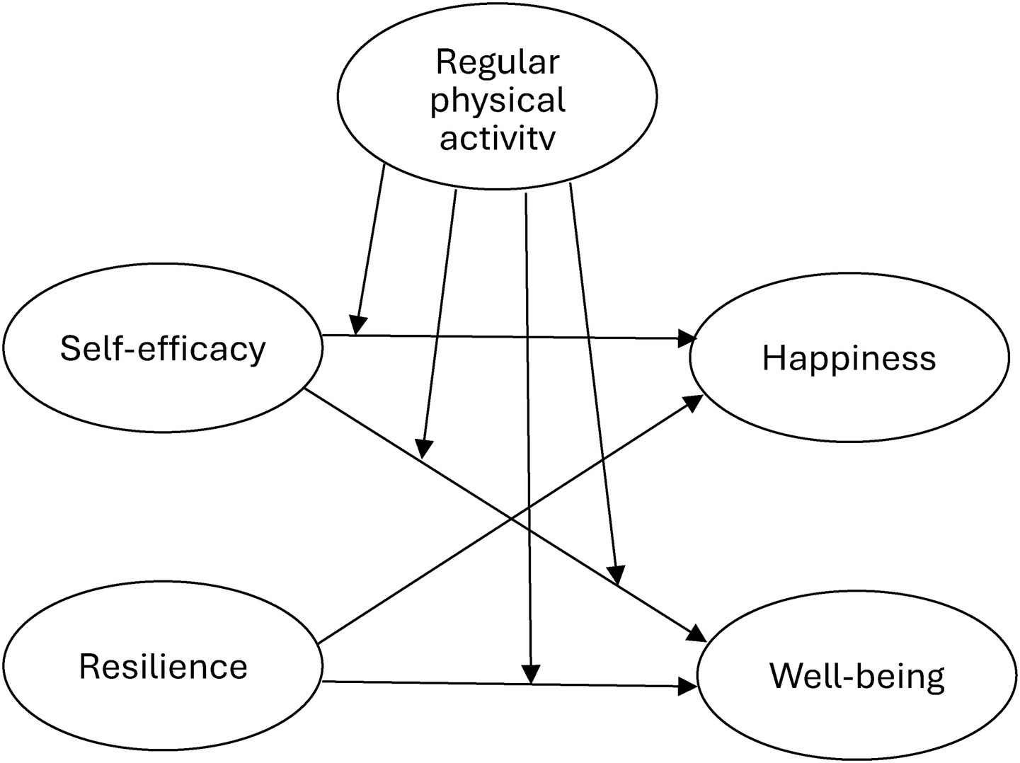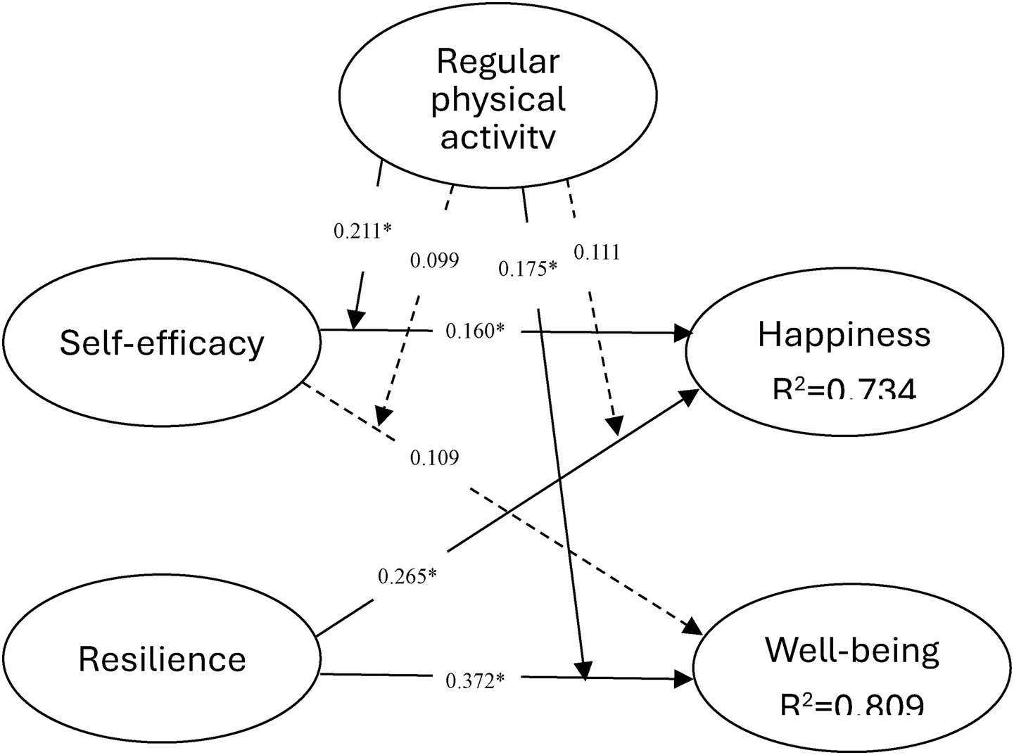 The collected data were analyzed via SPSS 28.0 and SMART-PLS 4.0. Independent samples t tests were conducted to examine the impact of regular physical activity on self-efficacy, resilience, happiness, and well-being. CFA was used to evaluate the scales’ reliability and validity. Finally, structural equation modeling (SEM) was employed to confirm the connections between self-efficacy, resilience, happiness, and well-being and to examine the moderating effect of regular physical activity.