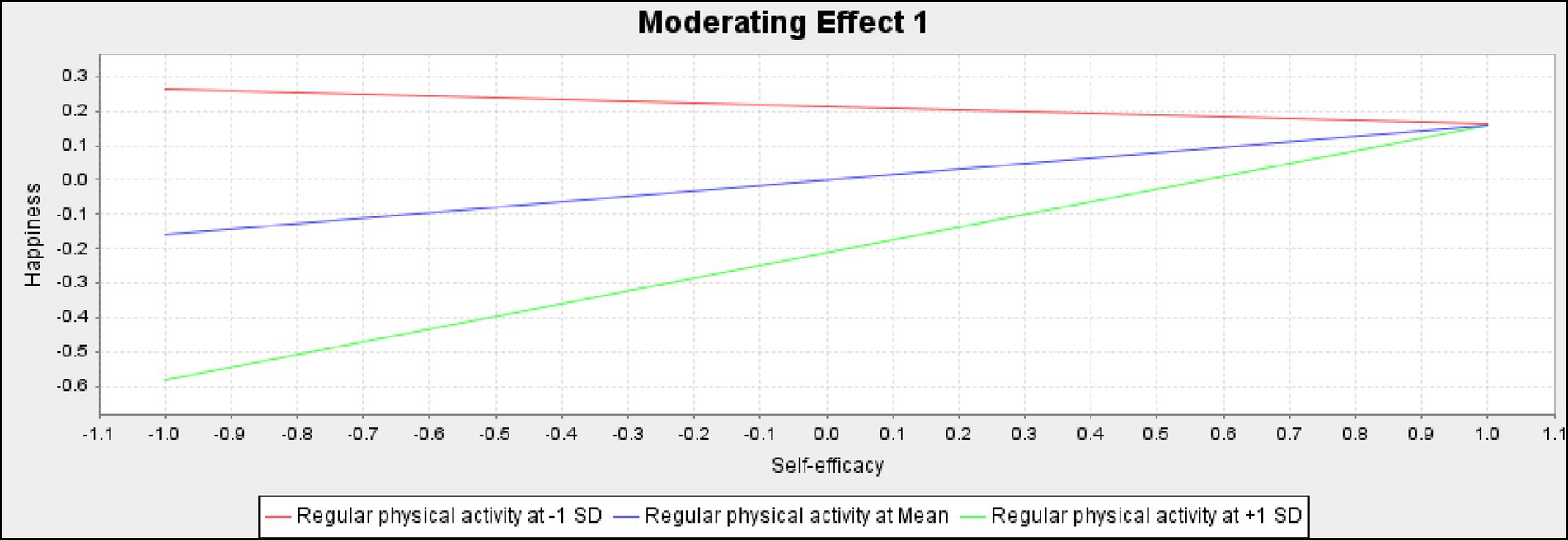 Figure 3. Moderating effects of regular physical activity on the relationship between self-efficacy and happiness.