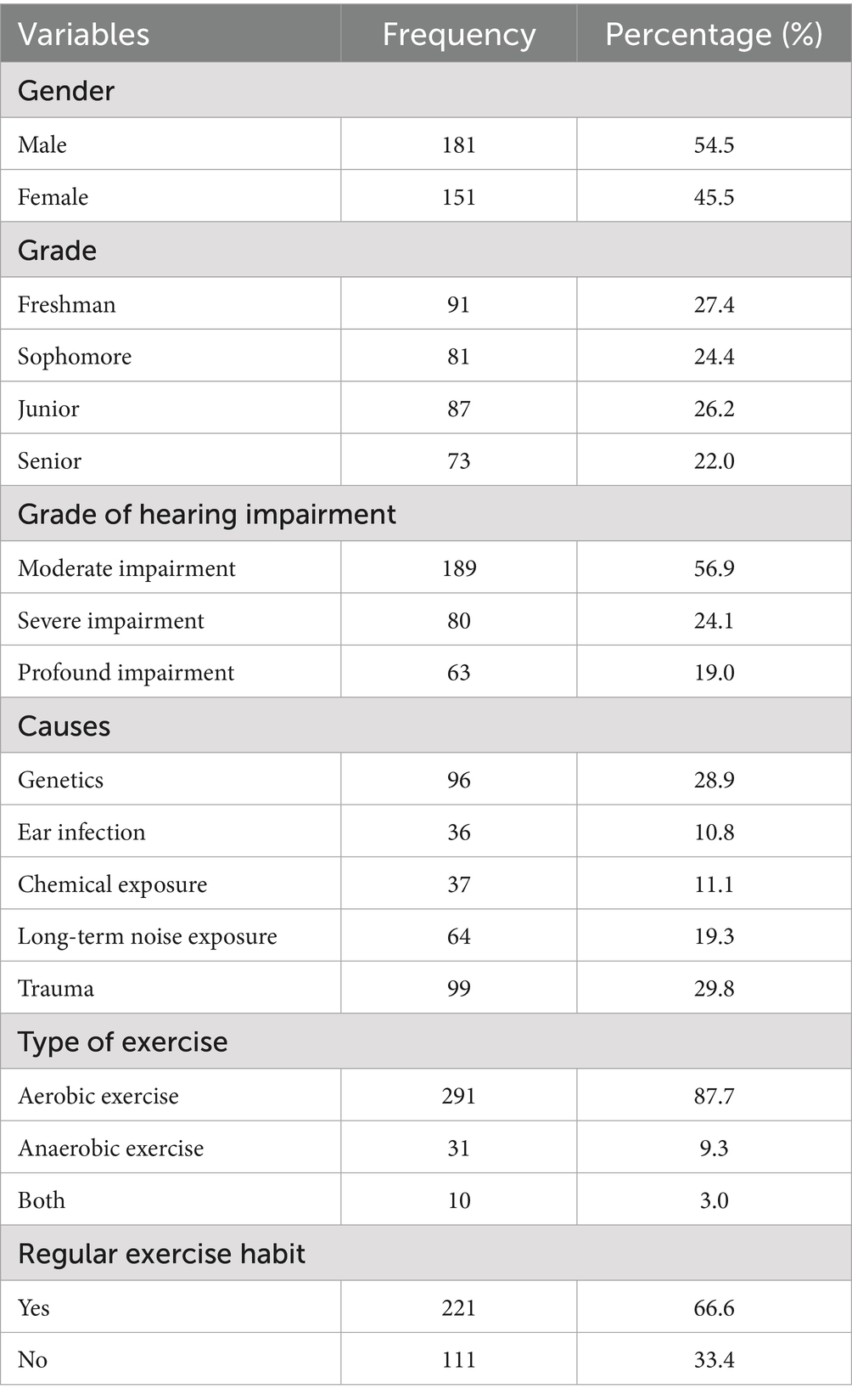 Data collection was conducted by two phrases. First, this study involved randomly selecting 10 universities in Guangdong Province (78 universities) that offer programs for students with disabilities. Second, purposive sampling was used to select eligible respondents who were university students diagnosed with moderate or more significant hearing impairment (bilateral hearing loss of 41–60 dBHL or above) according to the World Health Organization’s (2007) guidelines (World Health Organization, 2007). To gather data, the researcher sent an invitation email to the teachers in charge of the programs, inviting them and their students to participate in a questionnaire survey. After receiving permission, the researcher distributed hard-copy questionnaires on site, with the teachers assisting in translating and communicating with the students to ensure that each student understood the purpose and significance of the study. The questionnaire survey was conducted anonymously, and the purpose of the study, respondents’ rights, and data usage were explained in detail before the students filled out the questionnaire. Data collection took place from December 2023 to April 2024, ensuring a comprehensive and thorough process. A total of 354 questionnaires were collected, with 22 excluded because of incomplete responses, resulting in 332 valid questionnaires.