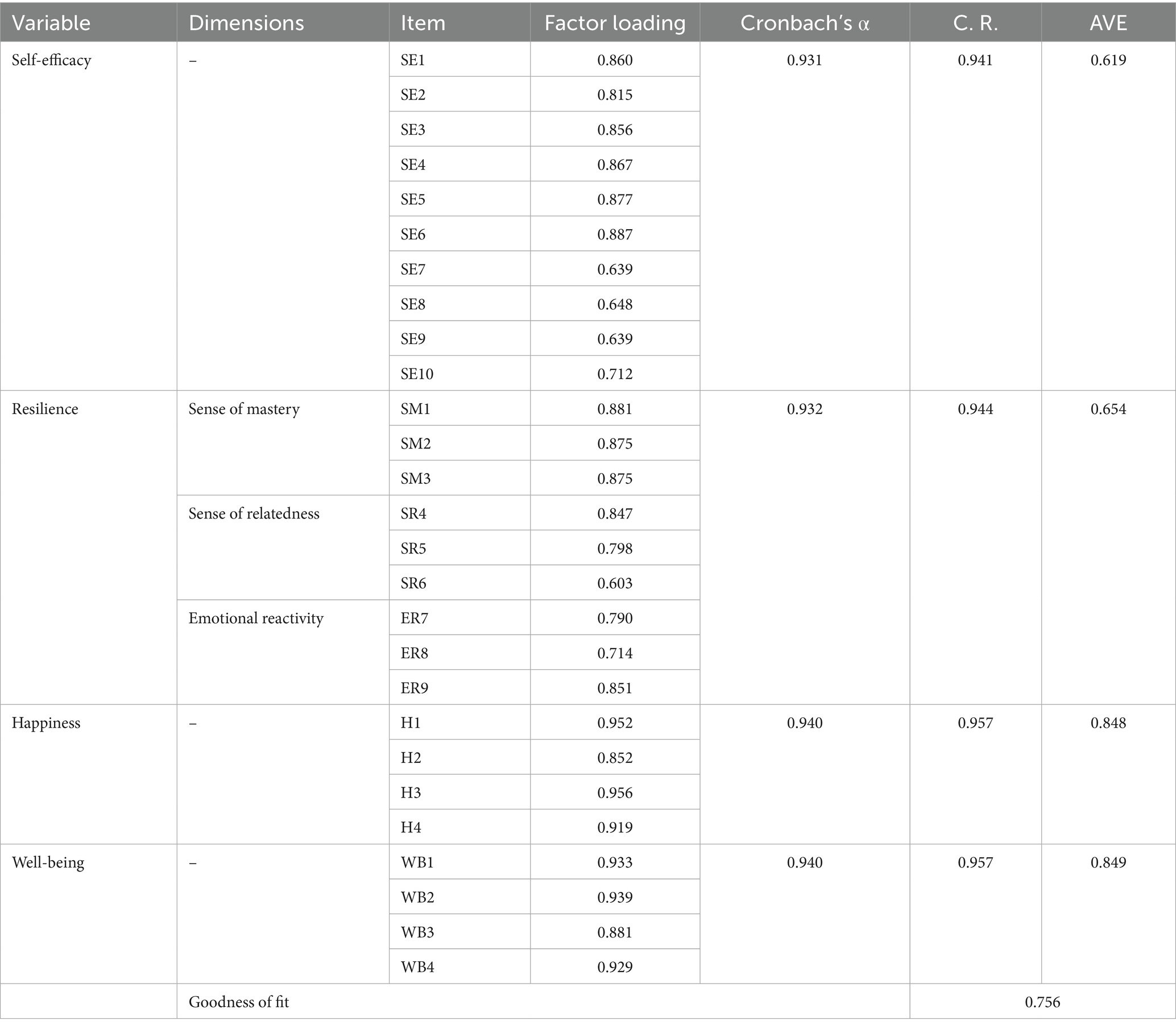 The present study meets the standard requirements for reliability and validity (see Table 2). The self-efficacy items (SE1 to SE10) exhibit factor loadings ranging from 0.639 to 0.887, indicating a moderate to high correlation with the underlying construct. The Cronbach’s α for self-efficacy is 0.931, indicating excellent internal consistency. The C. R. is 0.941, further confirming the reliability. The AVE is 0.619, indicating that the construct captures over 61% of the variance, providing comprehensive coverage of the self-efficacy construct. The resilience scale also demonstrated excellent reliability and validity. The high factor loadings range from 0.603 to 0.881, indicating robust correlations with the underlying construct. The Cronbach’s α is 0.932, indicating excellent internal consistency. The C. R. is 0.944, further confirming the scale’s reliability, with an AVE of 0.654, suggesting that the construct captures a significant portion of the variance. Additionally, the happiness-related items (H1–H4) have factor loadings ranging from 0.852 to 0.956, indicating strong correlations with the underlying construct. The Cronbach’s α is 0.940, and the CR is 0.957, indicating excellent reliability. The AVE is 0.848, which suggests that the construct explains 84.8% of the variance. Finally, the well-being items (WB1 to WB4) have very high factor loadings, ranging from 0.881 to 0.939. The Cronbach’s α is 0.940, and the CR is 0.957, with an AVE of 0.849, indicating high reliability and validity.