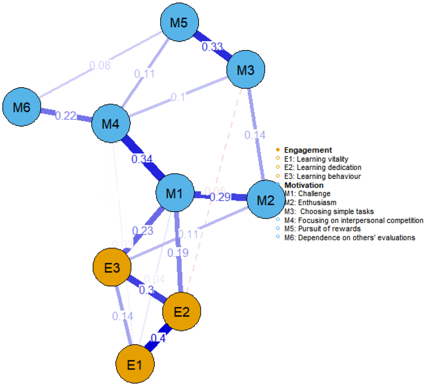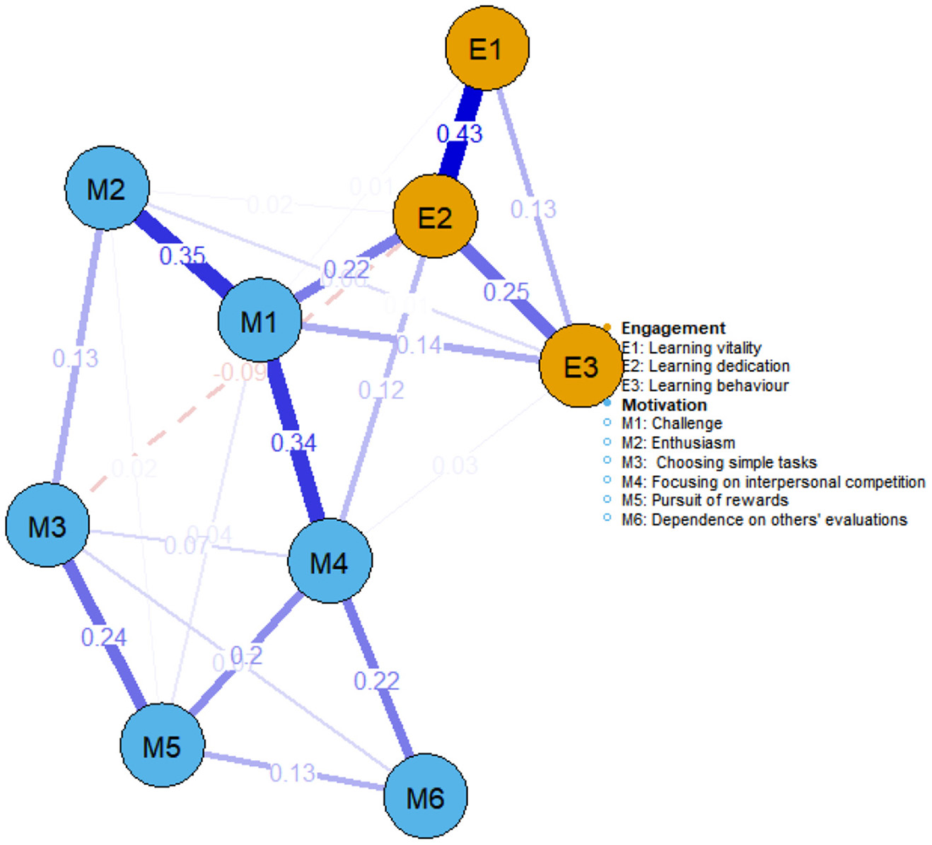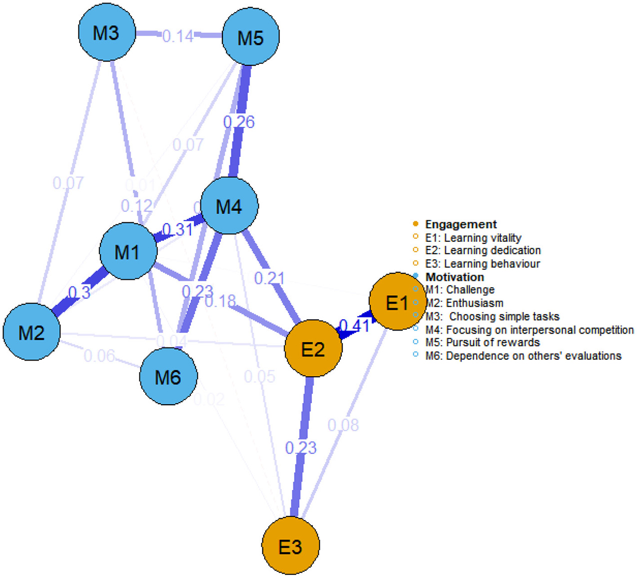 Network structure of learning motivation and learning engagement among self-funded medical students (n = 251).