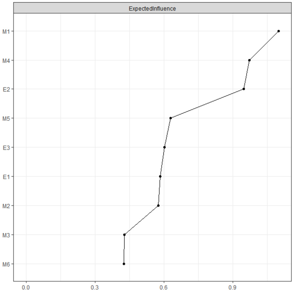 This study used the Expected Influence (EI) index as the core indicator of a node's influence within the network. EI is defined as the sum of the edge weights connected to a given node. A higher EI value indicates greater influence in the network. Unlike traditional measures of centrality (e.g., strength centrality), EI retains the original sign of the edge weights rather than taking their absolute values, enabling differentiation of positive and negative associations between nodes and providing a more comprehensive view of each node's impact within the network (Robinaugh et al., 2016).