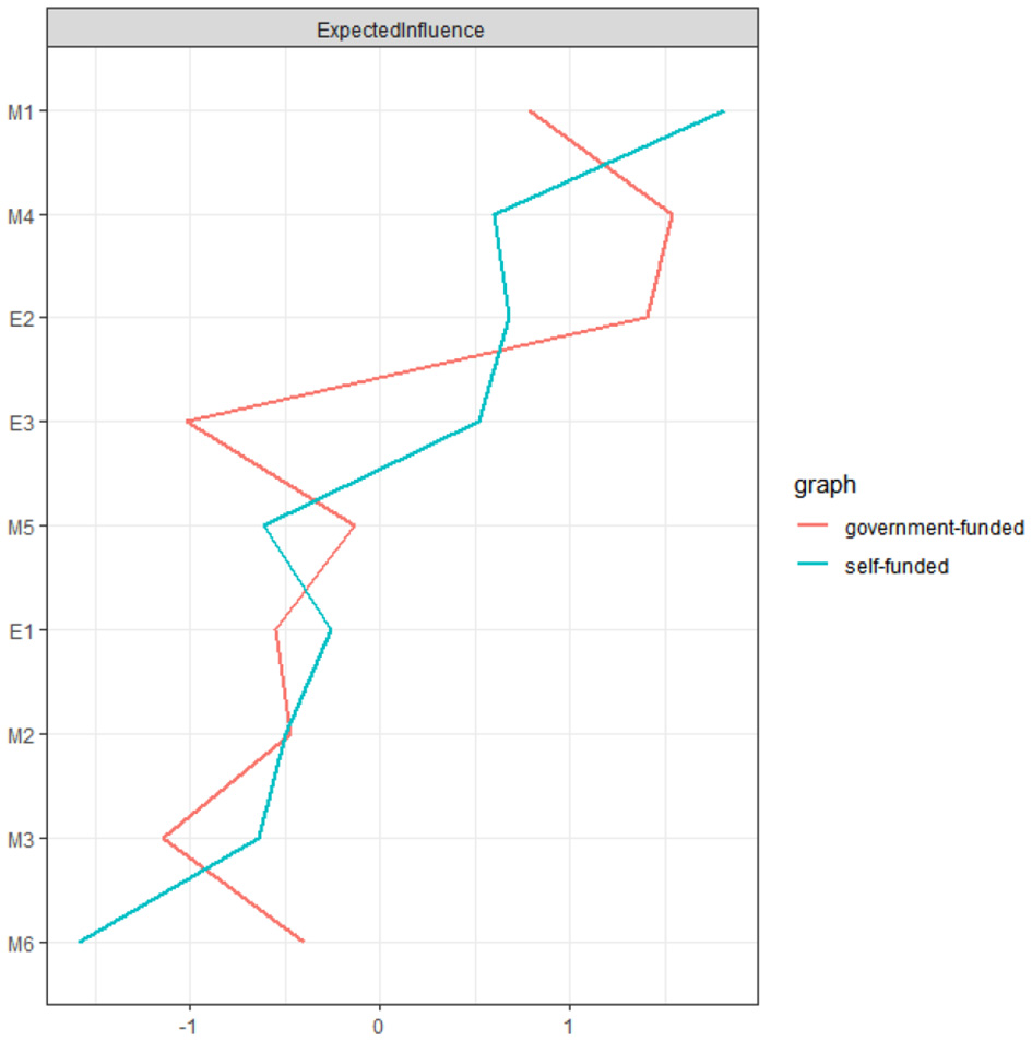 Figure 5 illustrates the EI indices for government-funded and self-funded students. In the government-funded sample, focusing on interpersonal competition ranked the highest, whereas choosing simple tasks showed the lowest EI. Among self-funded students, challenge was the most influential dimension, while dependence on others' evaluations had the lowest EI.