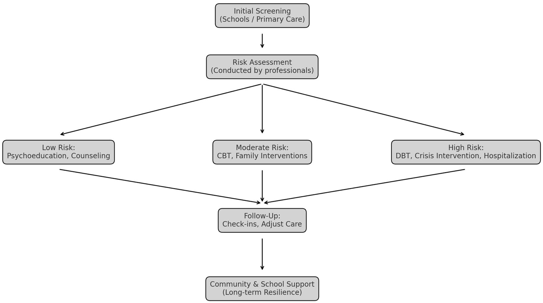 Figure 3. Stepped-care framework for adolescent suicide prevention. Initial screening occurs in schools or primary care, followed by professional risk assessment. According to risk level, interventions include psychoeducation and counseling for low risk, CBT and family interventions for moderate risk, and DBT, crisis intervention, or hospitalization for high risk. Ongoing follow-up, community, and school-based support promote long-term resilience.