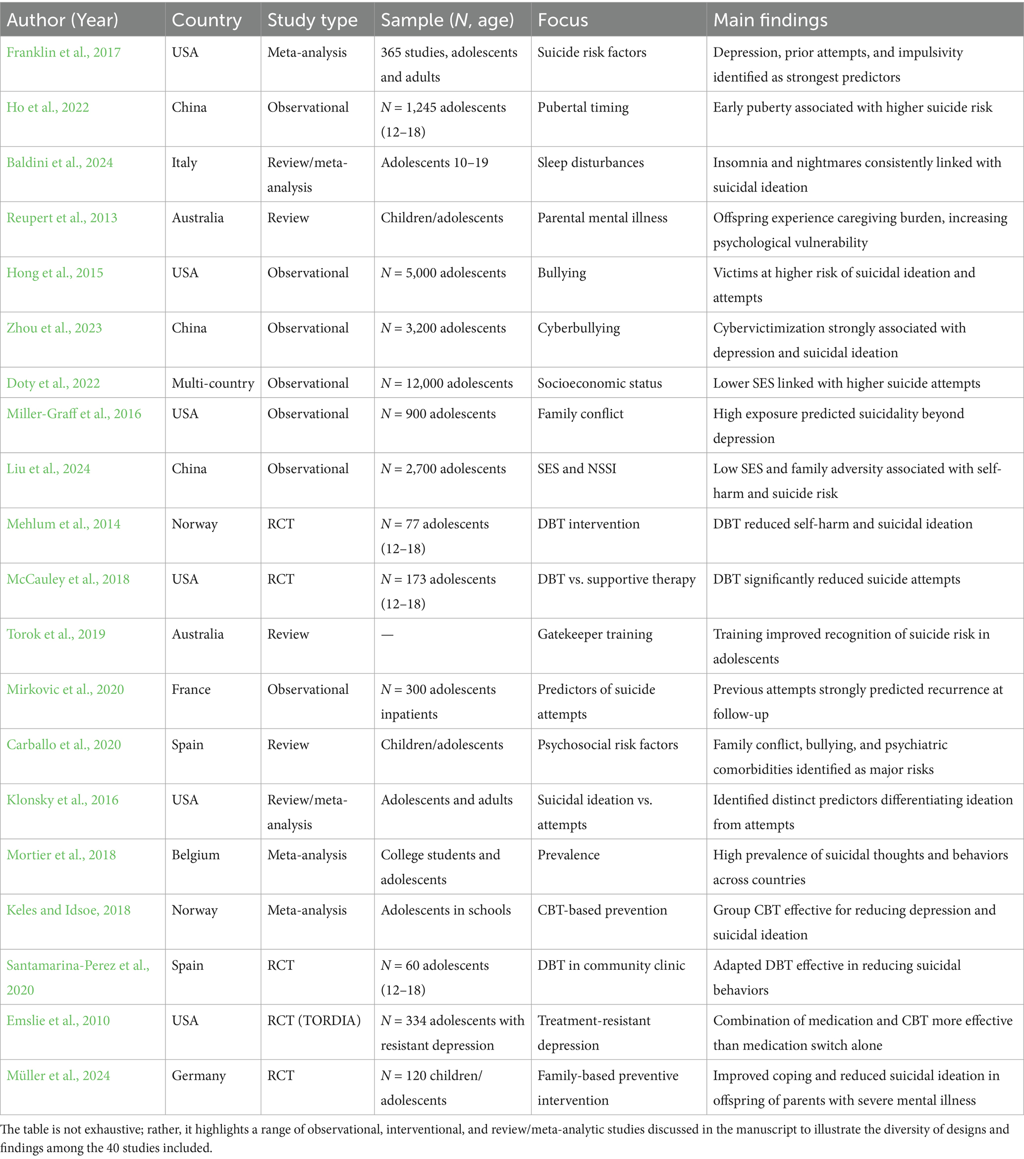 Adolescence is a crucial stage of development characterized by significant physical, emotional, and social changes. During this period, individuals navigate vital milestones in identity formation, peer relationships, and academic progress (World Health Organization, 2021). While these experiences foster growth and resilience, they may also contribute to vulnerabilities that can lead to mental health issues. Among the latter, suicide stands out as a leading cause of death among adolescents, ranking as the third leading cause of death for individuals aged 10 to 19 worldwide (Bridge et al., 2022). In this review, adolescence was defined as the age range 10–19 years, following the World Health Organization’s medical definition (World Health Organization, 2021). We did not include individuals aged 18–21 years, often called ‘late adolescents’ or ‘emerging adults,’ to stay consistent with this definition and ensure comparability across studies. The need to address adolescent suicide is underscored by its devastating impact on families, communities, and society.