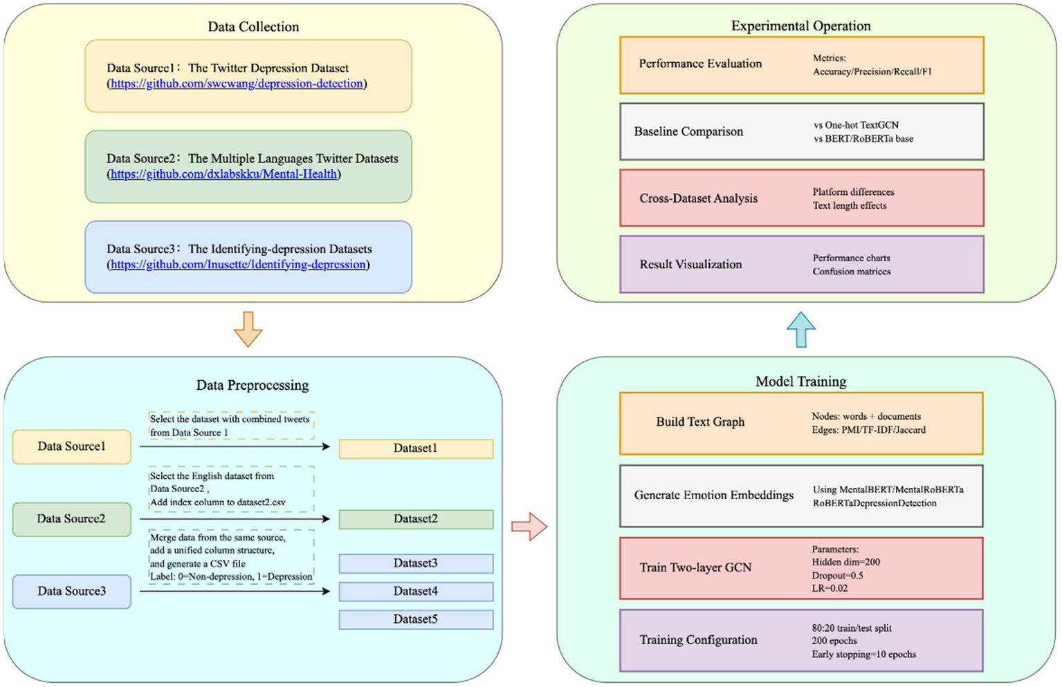 Building a model to identify depression through social media data typically involves a multi-step approach: data acquisition, data preprocessing, the creation of word representations, model training, and model validation. Emotion representation is a critical component of natural language processing (NLP), as it enables models to accurately capture the emotional nuances of human language, thereby enhancing their comprehension of emotional dimensions. The application of various techniques, such as word embeddings (e.g., Word2Vec, GloVe) and contextualized embeddings (e.g., BERT, RoBERTa), has been widely adopted to encode emotional cues in text, resulting in improved performance in tasks like text classification (Aydoğan and Karci, 2020), sentiment analysis (Rezaeinia et al., 2019), emotion detection, and depression detection (Lara et al., 2021; Lestandy and Abdurrahim, 2023). Recent research has integrated emotion representation into depression detection models, aiming to enhance accuracy and contribute to advancements in mental health research and practice. For example, models like TextGCN with Emotion Graph Representation have demonstrated promise in abstracting both explicit and implicit emotional signals associated with mental health, showcasing the potential of emotion representation in depression detection (Cabral et al., 2024).