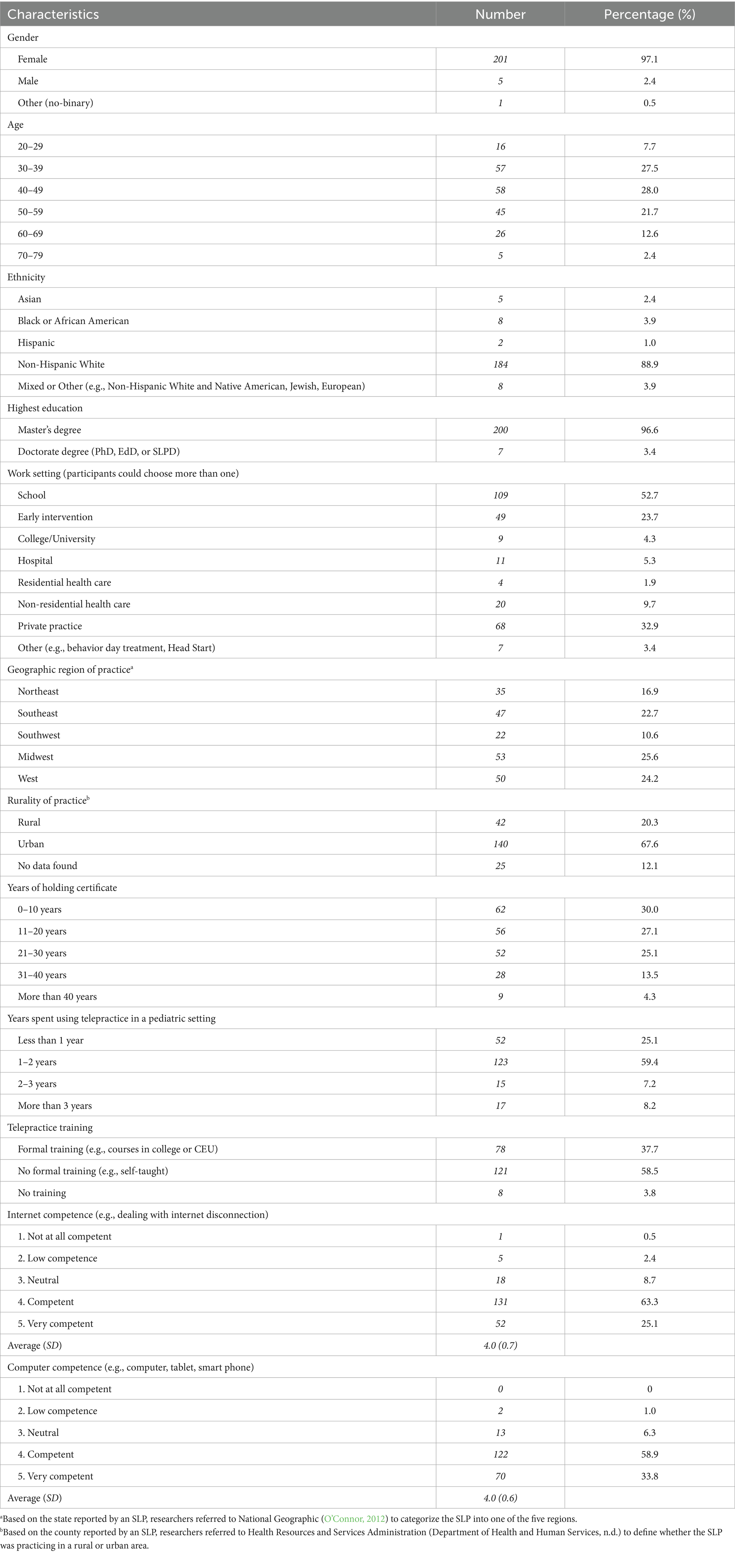 The study employed an e-survey, following Consensus-Based Checklist for Reporting of Survey Studies (CROSS) (Sharma et al., 2021). The research survey was organized into four sections. The first section included demographic questions (i.e., gender, age, ethnicity, etc.), years holding CCC-SLP certification, years of using telehealth in a pediatric setting, and prior telehealth training. In addition, SLPs were asked to report their telehealth caseloads and their entire working history caseloads, with regard to each of the disorders (ASD and SSD) and each of the age ranges (0–3 and 4–8). Altogether, the information in this section helped define the sample of SLPs. Digital literacy was put into two questions (i.e., internet competence and computer competence), as they are different concepts. Internet competence refers to their ability to connect to the internet and troubleshoot common connectivity issues. Computer competence refers to their ability to work, maneuver, or troubleshoot issues related to the use of a computer, tablet, smart phone, and other devices.