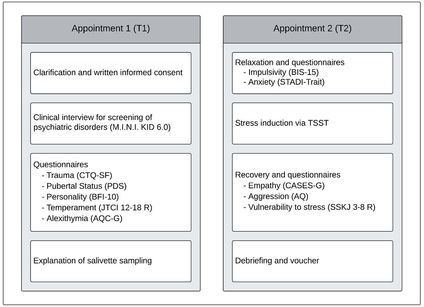 Overview of procedures at the first and second appointment. M.I.N.I. KID 6.0, mini international neuropsychiatric interview, 6th version; CTQ-SF, childhood trauma questionnaire–short form; PDS, pubertal development scale; BFI-10, big five inventory; JTCI 12–18 R, junior temperament and character inventory; AQC-G, alexithymia questionnaire for children, German version; BIS-15, barratt impulsiveness scale–short version; STADI, state-trait anxiety-depression inventory; TSST, trier social stress test; CASES-G, cognitive, affective, and somatic empathy scales, German version; AQ, aggression questionnaire, German version; SSKJ 3-8 R, questionnaire for the measurement of stress and coping in children and adolescents 3–8 R.