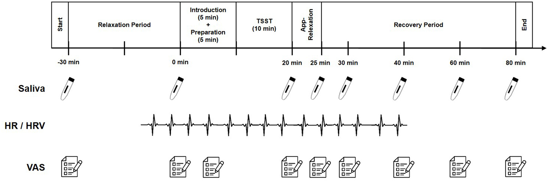 Overview of measurement time points for stress parameters across testing phases. TSST, trier social stress test; Saliva, saliva samples for cortisol and alpha-amylase; HR/HRV, heart rate/heart rate variability measures; VAS, visual analogue scale.