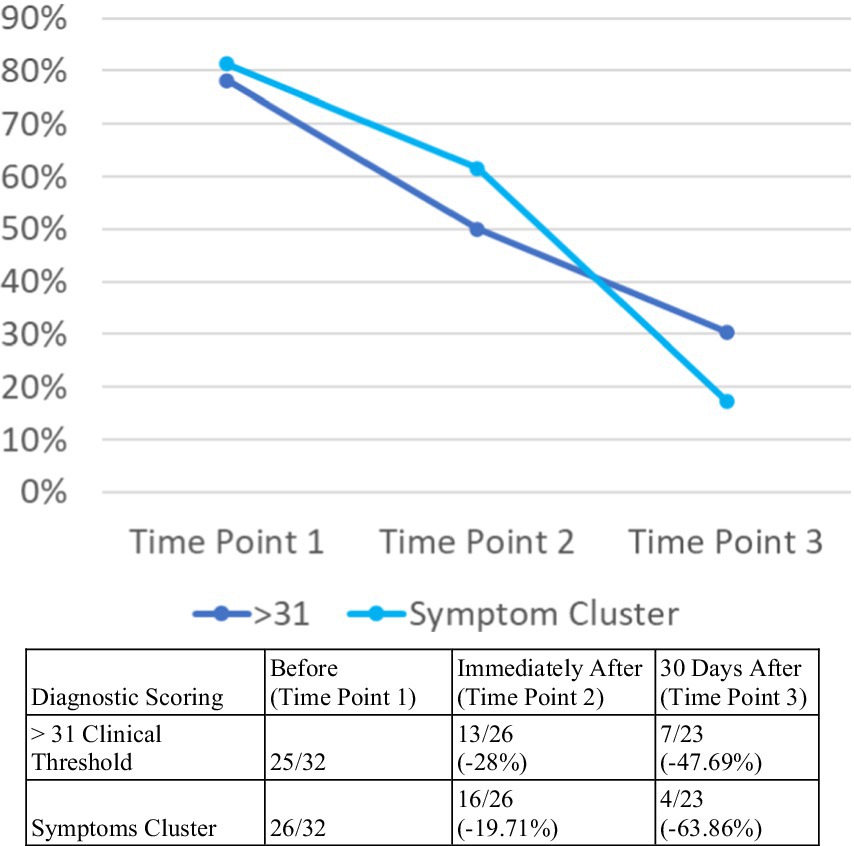 For those participants who completed the survey before the event and 30 days following the event, 90% (19/21) showed a reduction in their total overall score (Ossie, 2023). Two individuals (10%, 2/21) had a 5–10-point meaningful reduction in total score and an additional 71% participants (15/21) reported a 10–20 clinically meaningful reduction in total score (see Table 7).