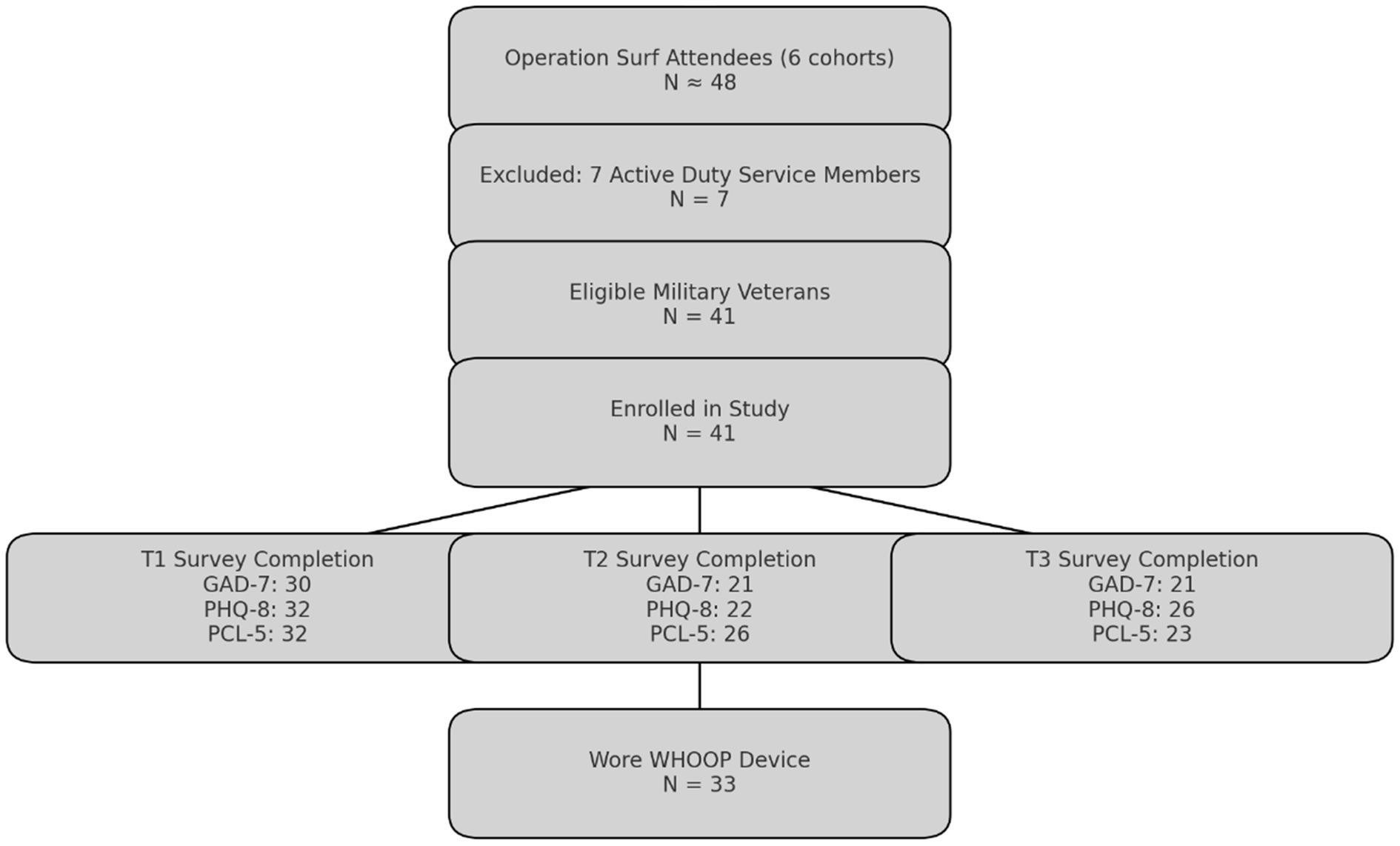 The sample size for this feasibility study was determined based on practical, methodological, and resource considerations. Given the exploratory nature and novelty of incorporating wearable technology for physiological measurement in surf therapy, no previous research provided effect sizes suitable for a priori power analysis. Therefore, the sample size was established primarily through convenience sampling, including all eligible military veterans enrolled in the Operation Surf therapy program within a one-year timeframe (May 2021 to May 2022). Operation Surf planned to hold six weeklong events during the May 2021 through May 2022 timeframe, each hosting eight military veteran participants, for a sample size of n = 48 participants. One of the events changed plans and invited seven active duty injured military participants, and one military veteran, therefore the sample size was reduced to n = 41 (Figure 1). A period of 1 year was considered a reasonable duration to collect data on participants within resource constraints typical of feasibility studies. This approach was deemed appropriate given logistical constraints, participant availability, and the goal of maximizing ecological validity in this unique real-world intervention setting, while also monitoring financial cost of conducting the programs and collecting the data. This study was also the first to integrate physiological biomarker data with psychological assessments, building upon previous work which relied solely on self-report psychological assessments and Operation Surf (Crawford, 2019), providing a foundational basis for future research in this area.