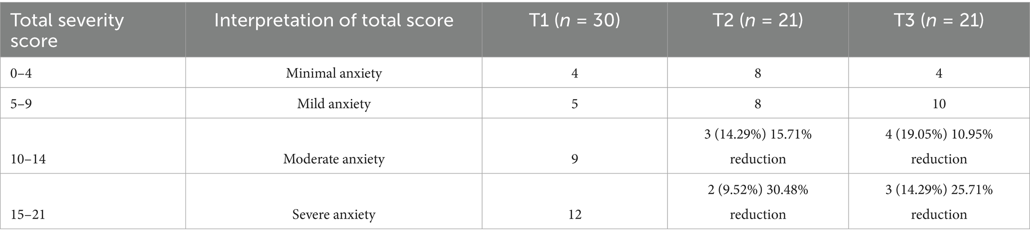 Prior to the event, 30% of participants (9/30) scored in the next highest classification of moderate anxiety (i.e., scoring between 10–14 on a 21-point maximum). Immediately after the event, 14% (3/21) scored as having moderate anxiety, indicating a 16% reduction in moderate anxiety scores immediately following the ocean therapy event. At 30 days following the event, 19% (4/21) scored as having moderate anxiety, indicating an 11% reduction in moderate anxiety 30 days after the event when compared to before the event (see Table 5).