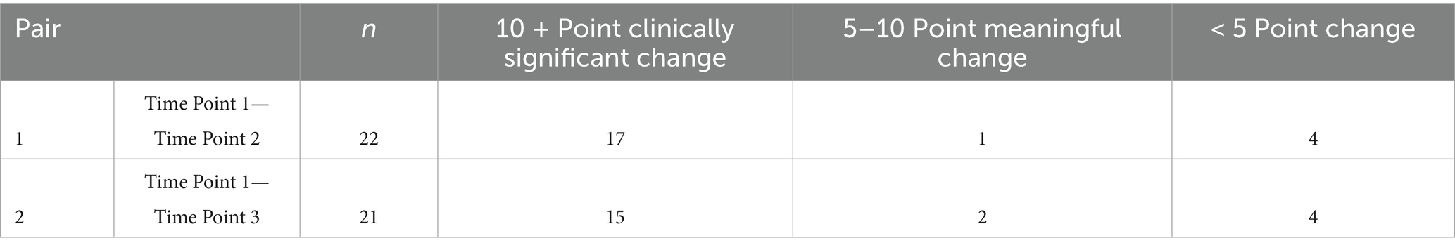 On an individual basis, 86% of participants (19/22) who completed the survey before the event and immediately after the event, saw a reduction in their severity score (Ossie, 2023). One individual (4.55%, 1/22) had a 5–10-point reliable reduction in total score, while an additional 77% participants (17/22) had a 10–20 point clinically meaningful reduction in score immediately following the event (see Table 6).
