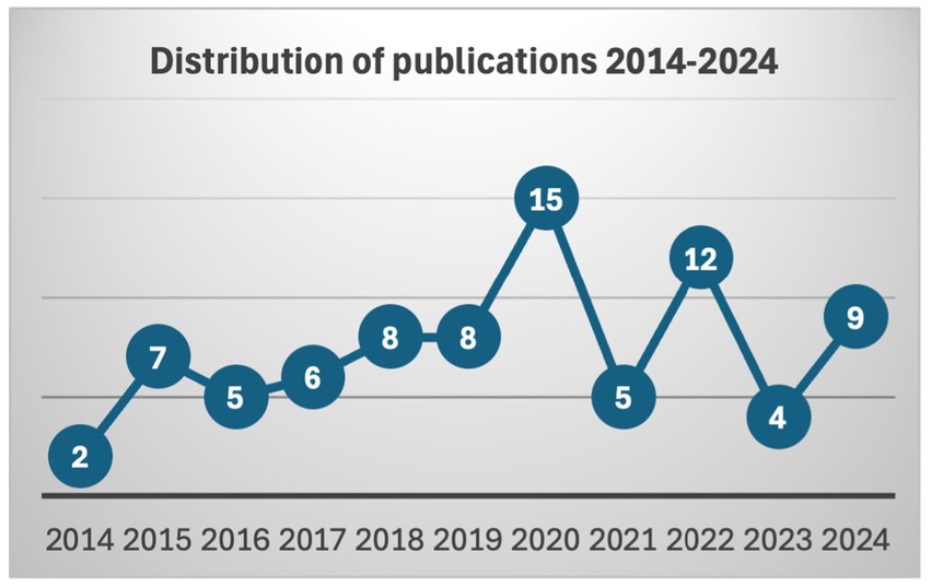 The review focused primarily on highlighting the distribution of the selected articles of the review through the decade covering from 2014 to 2024. As shown in Figure 2, the ‘journey’ began in 2014 with only two (02) publications. However, the following year shows an evolution of seven (07) publications. After that, the numbers again fell slightly, with four (05) in 2016, six (06) in 2017, and eight (08) in 2018, showing a quite dynamic technological trend. By 2019, the count reaches eight (08), and then there is a significant spike in 2020 with fifteen (15) publications, the highest across the aforementioned decade, followed by another substantial rise to twelve (12) in 2022. At that stage, we can recall that coincidentally 2020 is the year of the outbreak of the COVID-19 pandemic, which might have been the main factor influencing the academic community to publish against the increased exposure of children to touchscreens. Nonetheless, in 2021, there will be a drop back to five (05), as in 2016. The years 2020 and 2022 stand out as high points, while 2014 and 2023 had the least activity. Interestingly, 2023 falls to four (04), the lowest since 2016, before rising to nine (09) in 2024. The distribution suggests that more systematic and diverse research should be done.