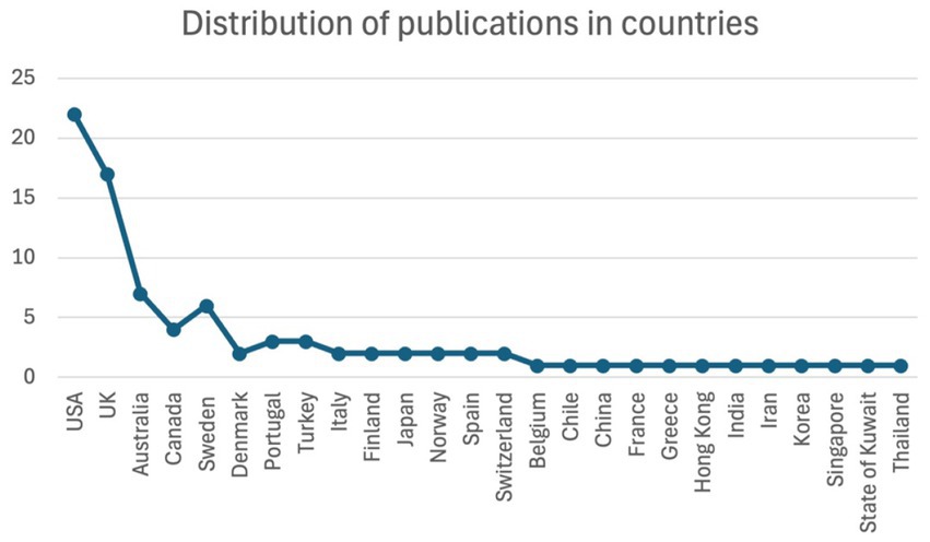 Another highlight of the review focused on showing the distribution of publications across countries, which presents a significant variation in research activity (Figure 3). The United States presented the highest number of outputs, with twenty-two (22) publications, followed by the UK with a slightly lower count and eighteen (17) outputs. Australia ranks third, contributing approximately seven (07) publications. A moderate output level is observed in Canada and Sweden, each with four (04) and five (05) publications, accordingly. In addition to these leading countries in scholarly output, there is a long list of countries, including Denmark, Portugal, Turkey, Italy, Finland, Japan, Norway, Spain and Switzerland, that have contributed between two (02) to three (03) publications. Even lower is the distribution in other parts globally, such as Belgium, Chile, China, France, Greece, Hong Kong, India, Iran, Korea, Singapore, the State of Kuwait, and Thailand, typically with one (01) publication each. While these figures highlight geographic trends in research activity, the specific factors underlying national contributions are not identified in this analysis. This disparity suggests an engagement with the topic across a diverse international group expanding beyond Europe. The current distribution highlights dominant research activity that emerged mainly from Western countries. On the other hand, there is a limited representation from Asian, Middle Eastern, and South American regions. The distribution suggests collaboration in future research to ensure more comprehensive and culturally diverse perspectives.
