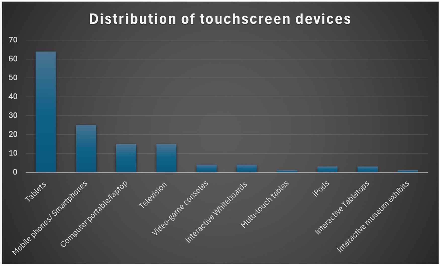 The classification of touchscreen devices in the selected reviewed studies reveals several notable trends (Figure 4). Interestingly, we make the distinction that studies using more than two devices may overlap and fall into multiple categories. Among these, ‘Tablets’ emerge as the most prominent, with sixty-four (64) studies using tablets (e.g., iPads or Android tablets). Similarly, the category of ‘Mobile phone/smartphone’, with twenty-five (25) papers. In contrast, the categories ‘Television’ and ‘Computer/laptop’ are each represented by fifteen (15) papers. The rest of the devices such as ‘Video-game consoles’, ‘Interactive Whiteboards’, ‘Multi-touch tables’, ‘iPods’, ‘Interactive Tabletops’ and ‘Interactive Museum exhibits’ fall into the category of a few studies from one (01) to four (04). Overall, the findings strongly focus on using tablets, particularly iPads, whether in school or family settings. A significant number of studies employed smartphones. A small number of studies reviewed proved to include more than one screen device but not exclusively touchscreen. Consequently, a more elaborate description of the prominent touchscreens’ design and functionalities is addressed in the first research question in the next section.