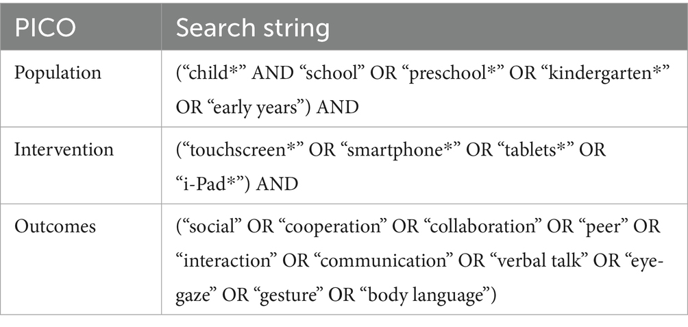 We conducted a comprehensive literature search covering the period from January 2014 to December 2024 to capture all relevant original empirical studies published in peer-reviewed scientific journals over the past decade. The search strategy was systematic and guided by a set of detailed, pre-defined search terms, along with clearly established inclusion and exclusion criteria. These criteria were developed using the PICO framework (Population, Intervention, Comparison, and Outcome) to ensure methodological rigor and relevance. Additionally, the review protocol was pre-registered on the Open Science Framework to enhance transparency and reproducibility.1 As shown in Table 1, we present all the terms used in our search strategy. Searches were performed across three electronic online databases, including Web of Science (WoS), ERIC, and Scopus, to capture a wide array of peer-reviewed articles. Another reason we decided on these digital databases is because of their coverage across the different disciplines of interest. Initially we sought to establish precise search parameters, including key terms and phrases related to our research topic, such as “Digital media” AND “Age” AND “Education level” AND “Social Development” AND “Communication skills.” Yet, no other systematic review has been published to be used as a reference point. We tried all possible extensions of keywords to narrow down the results. We utilized Boolean operators to enhance our search, combining terms with “AND” and “OR” and “AND NOT” ensuring a focus on social development—particularly peer interaction and cooperation—while also capturing all types of communication skills and its features with our scope. The initial search string with terms in each topic included was SS = (“touchscreen*”) AND (“child*”) AND NOT (“youth” OR “adolescent*” OR “elderly”) AND (“school” OR “preschool*” OR “kindergarten*” OR “early years”) AND NOT (“primary school” OR “middle school” OR “elementary school” OR “secondary school” OR “university” OR “college” OR “higher education”) AND (“social” OR “cooperation” OR “collaboration” OR “peer” OR “interaction”) AND (“communication”) AND NOT (“disability” OR “disorder” OR “implant” OR “autism” OR “spectrum” OR “dystonia” OR “health”). After the first cycle of searching that did not identify sufficient registers in either of the three databases, we came to the conclusion that there was a tendency in the literature to use terms for the type of device (smartphone, tablet) or even the term used by a certain brand (iPad) rather than their broader touchscreen category. Thus, we reformulated the query by replacing the term “touchscreen” with more specific terms for these devices taken from their marketized names. Moreover, as suggested by Webster and Watson (2002), we conducted a backward search to identify relevant work cited in similar reviews but without much success. Only reports were mainly obtained by our search, which focused on screen use and children’s health (mental & physical), safety, and wellbeing (House of Commons Education Committee, 2024; POSTnote365, 2020). In Appendix A, there is a presentation of search strings and queries of the three databases.