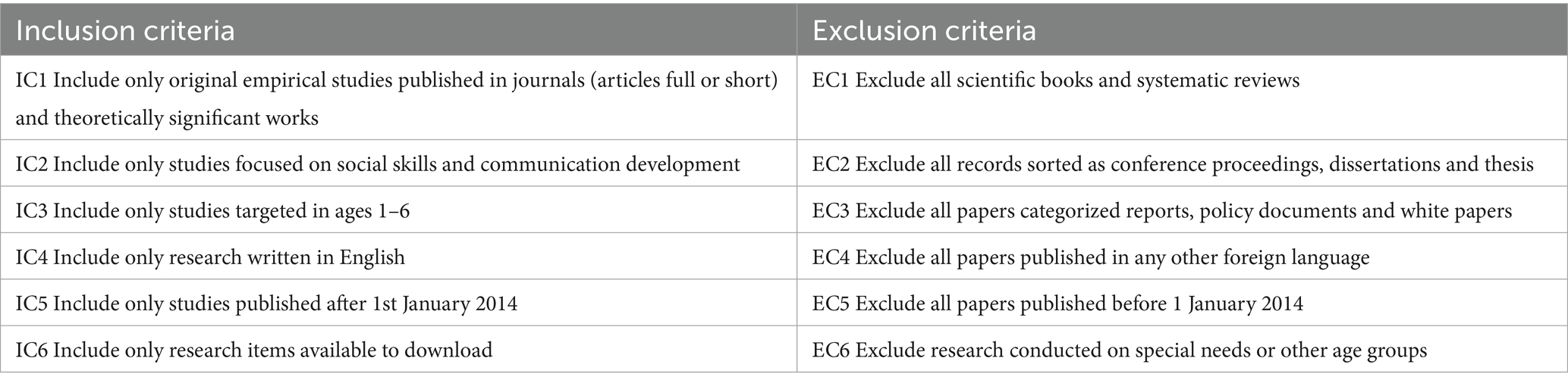 The research team initiated the collection of relevant studies across three electronic online databases: WoS, ERIC and Scopus. A specific set of inclusion and exclusion criteria was established to guide the present research, focusing on the publication year, publication type, subject areas, participants’ age, and education level (Table 2). The publication period was restricted to 2014–2024 primarily due to the limited number of earlier studies and the impact of two significant US reports published in 2022 and 2025—American Academy of Pediatrics (2022) and Common Sense Media (2025)—which might have influenced subsequent research on the topic. Additionally, article types such as reports, white papers, systematic reviews, proceedings, books and dissertations were excluded due to this. Papers focusing solely on academic learning and without empirical research were excluded. However, we decided to include a small number of theoretically significant works, which is a minor justified adaptation due to their conceptual nature and retained due to their relevance to review questions 2, 3 and 4. These articles did not report participant data, and this is reflected in the summary table (Appendix B) where ‘Not applicable’ is used in the sample size column.