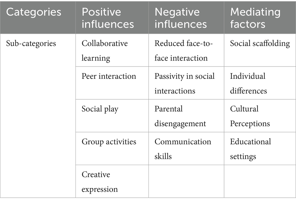 To address the second research question regarding the influence of touchscreen use on young children’s social development, including their ability to engage in peer interactions and cooperation, the research team systematically reviewed all relevant studies. Each study’s findings were recorded in relation to the second research question and validated by all team members. The data were then entered into NVivo 12 Plus, utilizing its auto-coding capabilities to identify recurring themes related to the impact of touchscreen use on young children’s social development. A content analysis was then performed (Neuendorf, 2017) and a coding scheme was developed to categorize the research studies’ findings. Three main categories emerged from the data: (i) positive influences, (ii) challenges and considerations, and (iii) mediating factors. Specifically, the reviewed studies highlighted several key advantages and disadvantages for children’s social development, along with some mediating factors. These findings are presented in Table 3 and analyzed below: