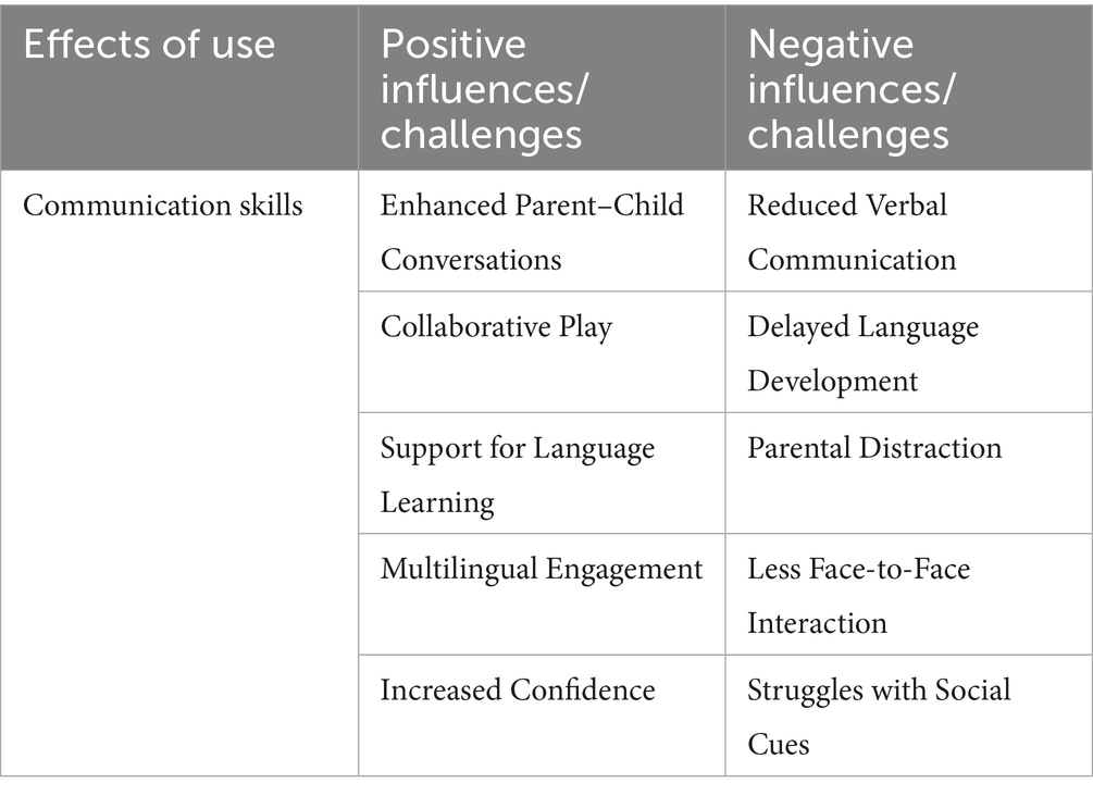 To address the third research question regarding the influence of touchscreen use on young children’s communication skills, including their ability to engage in verbal and non-verbal interactions, the research team systematically reviewed all selected studies. Each study’s findings were recorded in relation to the third research question and validated by all team members. The data were then entered into NVivo 12 Plus, utilizing its auto-coding capabilities to identify recurring themes related to the impact of touchscreen use on young children’s communication skills. A content analysis was then performed (Neuendorf, 2017) and a coding scheme was developed to categorize the research studies’ findings. Two main categories emerged from the data: (i) positive influences and (ii) challenges. The reviewed studies highlighted several key advantages for children’s communication development and some considerable disadvantages, which are presented in Table 4 and analyzed below: