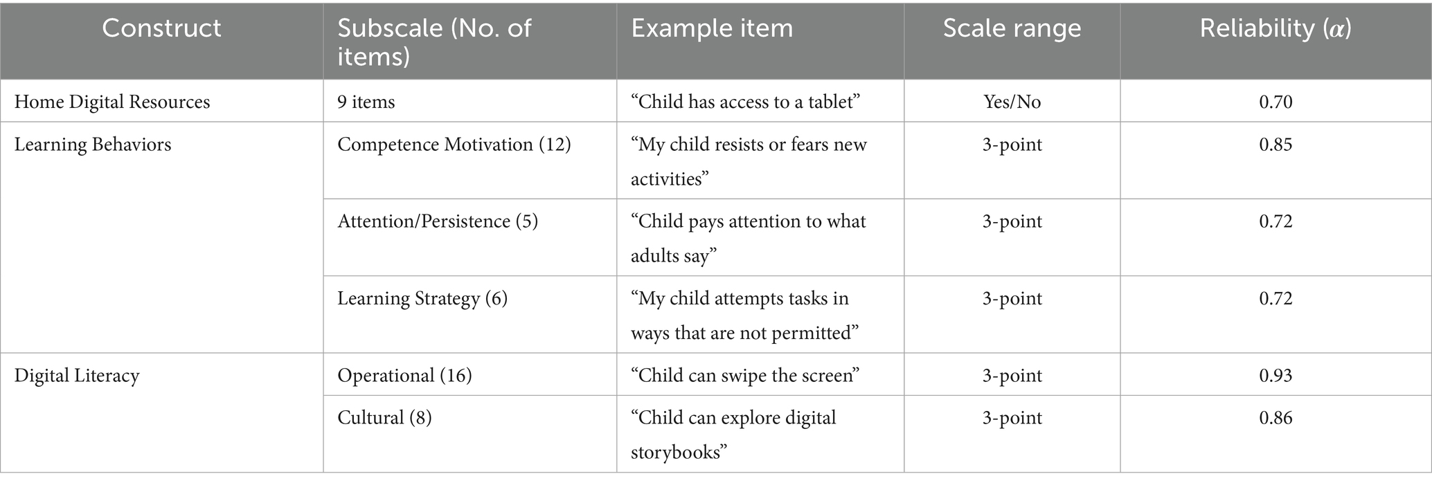 Home digital resources, learning behaviors, children’s digital literacy were measured using validated scales. Each measure was selected for its theoretical grounding and prior use in early childhood research. Reliability coefficients for the present sample are reported in Table 1.