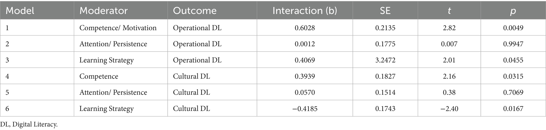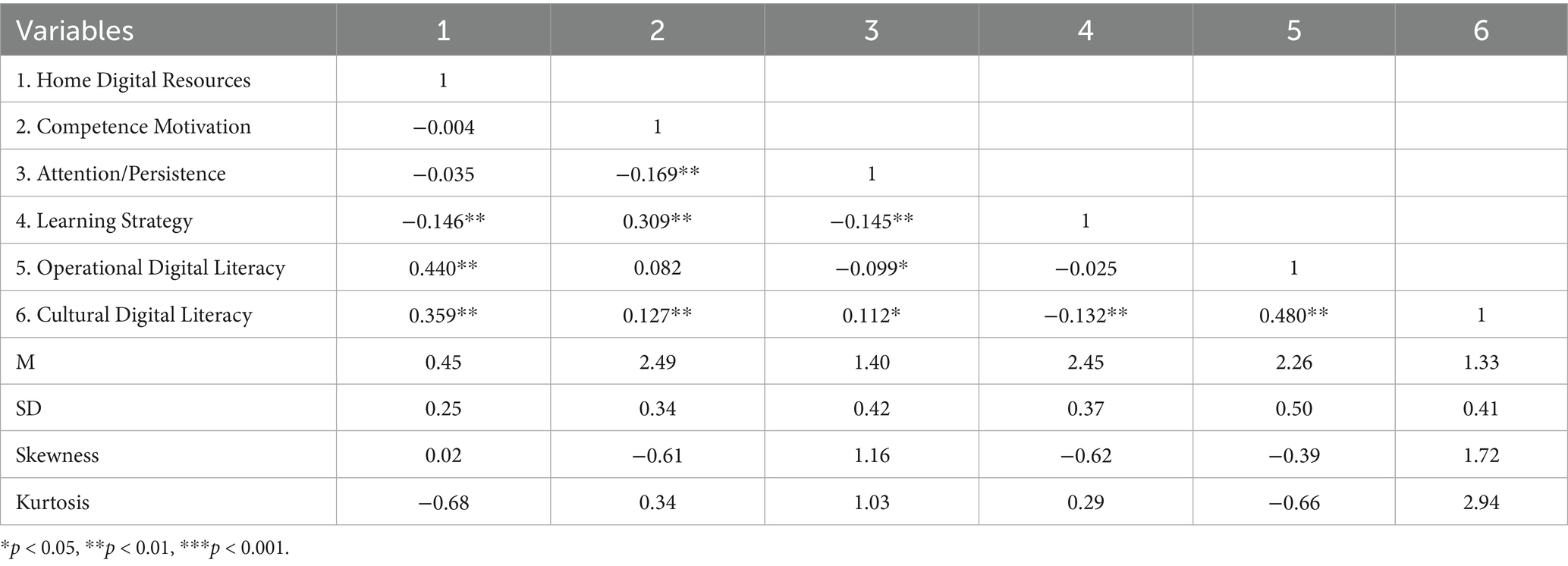 Correlation analyses showed that greater access to digital resources was positively associated with both operational and cultural digital literacy. Children with higher competence motivation and better learning strategy tended to have higher digital literacy scores. Interestingly, learning strategy was negatively associated with cultural digital literacy, implying that children who relied less on structured learning approaches may have engaged more flexibly in digital play. Attention and persistence showed a weak, mixed relationship with literacy outcomes.