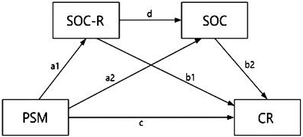 We examined SOC-R and SOC as chain mediators between PSM and CR, as shown in Figure 1. Therefore, three indirect effects of PSM were specified: (1) through SOC-R (a1, b1); (2) through SOC (a2, b2); and (3) through SOC-R and SOC (a1, d, b2). Significant results support the chain mediation model (Hayes, 2018).