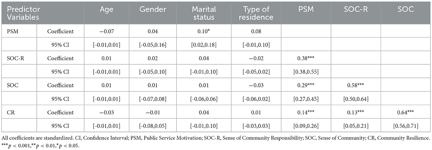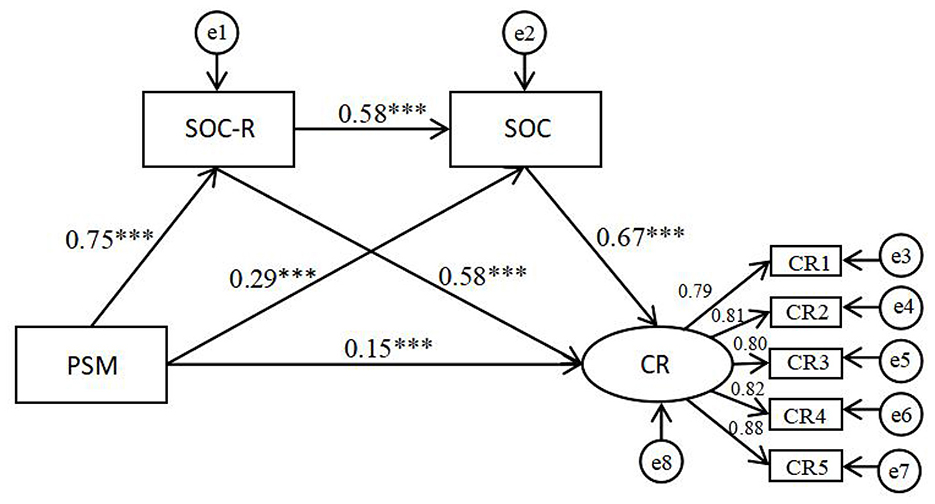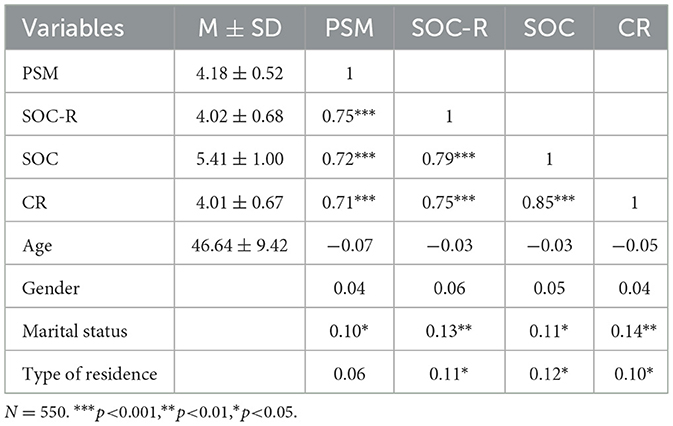 The descriptive statistics of each variable and the variable intercorrelations are shown in Table 1. The demographic variable of marital status were significantly and positively correlated with PSM (r = 0.10, p < 0.05), SOC-R (r = 0.13, p < 0.01), SOC (r = 0.11, p < 0.05), and CR (r = 0.14, p < 0.01). Type of residence was significantly and positively correlated with SOC-R (r = 0.11, p < 0.05), SOC (r = 0.12, p < 0.05), and CR (r = 0.10, p < 0.05). PSM was significantly and positively correlated with SOC-R (r = 0.75, p < 0.001), SOC (r = 0.72, p < 0.001), and CR (r = 0.71, p < 0.001). SOC-R was significantly and positively correlated with SOC (r = 0.79, p < 0.001) and CR (r = 0.75, p < 0.001). There was also a significant positive correlation between SOC and CR (r = 0.85, p < 0.001).