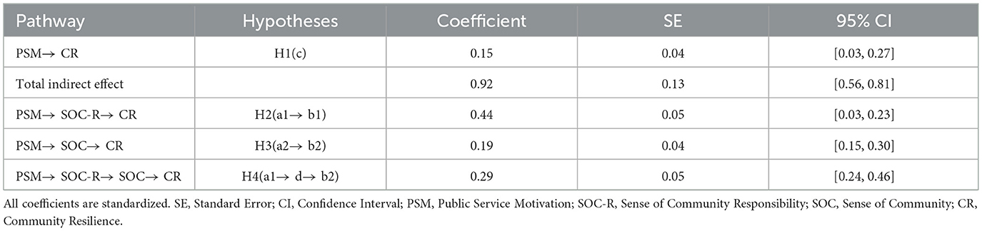 Subsequently, a structural equation model was constructed using AMOS 21.0 software for the purpose of testing the hypothetical model. The structural equation model was constructed using a bootstrapping procedure, which entailed the drawing of 5,000 bootstrapping samples and the computation of 95% confidence intervals (95% CI). The results indicated that the total effect of public service motivation on community resilience was significant (b = 0.84, SE = 0.05, p < 0.001) with a 95% confidence interval of [0.73, 0.94]. More importantly, the total indirect effect of public service motivation on community resilience was also significant (b=0.67, BootSE=0.13, 95% BootCI [0.56, 0.81]). The confidence intervals did not contain 0, indicating that the mediating effects of community responsibility and sense of community held (Preacher and Hayes, 2008) and mediated in the model. All indirect effects are shown in Table 3.