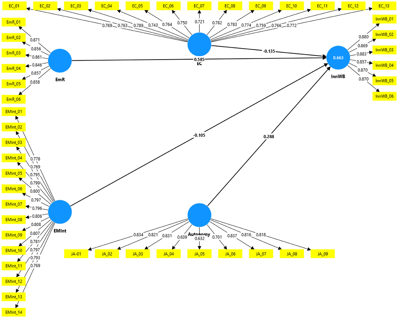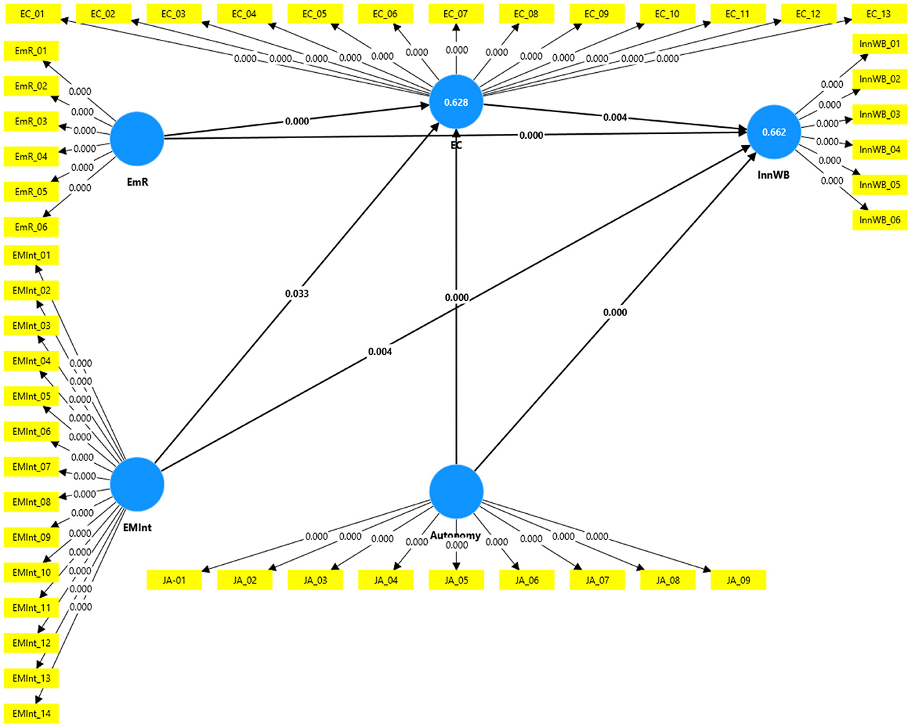 According to the PLS–SEM findings, (H1) testing the direct effects of emotional intelligence on employee innovation revealed a significant relationship (β = −0.107, t = 2.879, p = 0.004). H2 found a significant relationship between emotional intelligence and employee creativity (β = 0.075, t = 2.132, p = 0.033). Thus, H1 and H2 were supported. Further, H3 and H4 indicated that employee resilience has a positive and significant influence on employee innovation and creativity (β = 0.587, t = 13.159, p = 0.000); (β = 0.466, t = 9.133, p = 0.000). These results thus confirm hypotheses H3 and H4. The findings demonstrated that job autonomy has a significant influence on employee innovation and creativity (β = 0.289, t = 4.919, p = 0.000); (β = 0.420, t = 8.513, p = 0.000). Thus, both H4 and H6 were supported. Finally, H7 found a significant relationship between employee creativity and employee innovation (β = −0.141, t = 2.885, p = 0.004). This thus confirms hypothesis H7.