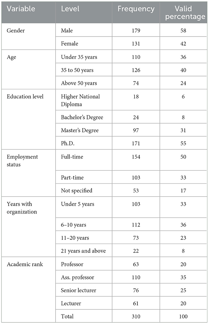 This research focused on analyzing full-time academic staff members at four universities located in South-Western Nigeria. The target population for this study comprised senior lecturers, associate professor and professor from both federal and state universities in the region. The selected institutions are considered first-generation universities, indicating that they were among the earliest established based on their institutional status. Convenience sampling was chosen for this research due to its accessibility and adaptability, which provided advantages for the study. The sample size for this research was determined using the Taro Yamane formula, ensuring a 95% confidence level (Yamane, 1973). Insert the numbers into the equation; the sample count is 307, yet the formula for sample size specifies the necessary number of responses. To accommodate individuals who are unreachable, it is common to increase the sample size by 30% to compensate for non-response (Yesuf et al., 2023). To ensure the data's reliability, the researchers expanded the sample size to 400 participants. They distributed 400 Google survey forms and received 329 completed responses. An additional 19 responses showed less than 20% missing data and exhibited a very low standard deviation. Upon closer examination, it was found that these participants had provided nearly identical answers to almost every survey question, rendering their responses of little value, and thus, they were excluded from further analysis. Ultimately, 310 questionnaires were fully completed without any missing data. The final sample (N = 310) is composed of 179 males and 131 females. The demographic information is presented in Table 1.