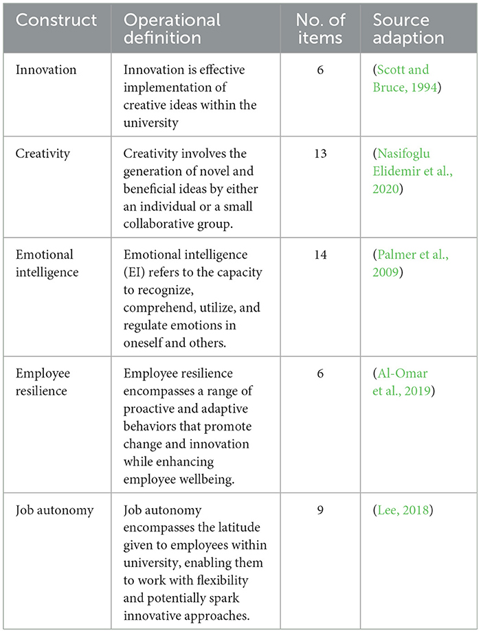 The survey instrument comprises 48 items in total. A 6-item scale (Scott and Bruce, 1994) was utilized to assess innovation, with an example item being “I am able to search for new working methods, techniques or instruments”. Creativity was evaluated using a 13-item scale from (Nasifoglu Elidemir et al., 2020), which includes items such as “I suggest new ways of performing work tasks”. Additionally, emotional intelligence was gauged using a 14-item scale from (Palmer et al., 2009), featuring items like “I appropriately communicate decisions to stakeholders”. A 6-item scale from (Al-Omar et al., 2019) was employed to measure employee resilience, with a sample item stating “I usually come through difficult times with little trouble”. Finally, job autonomy was assessed using a 9-item scale (Lee, 2018), which includes items such as “The job allows me to make decisions about what methods I use to complete my work”. This survey is being conducted to explore how academic members at universities perceive their own abilities to be creative and innovative within their professional settings.