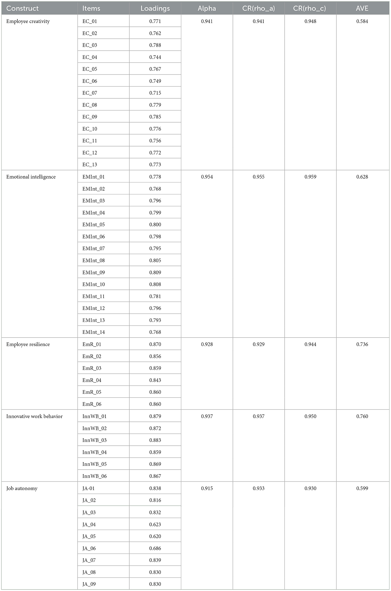 Hair et al. (2017) and Duarte and Raposo (2010) recommended to evaluate the reliability of individual items by analyzing the outer loadings of each measure across all constructs. Additionally, there is a general guideline to keep items with reliability scores between 0.40 and 0.70. Consistent with this, the outer loadings of all items in this study are observed to be 0.5 or higher (see Table 1), indicating that our study meets the criteria for acceptable item reliability.