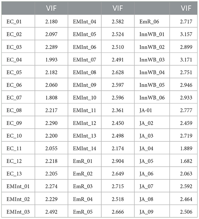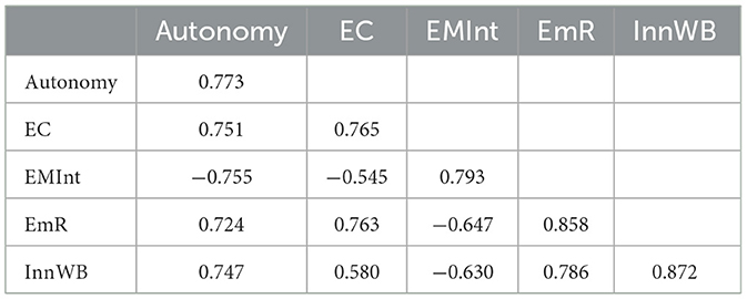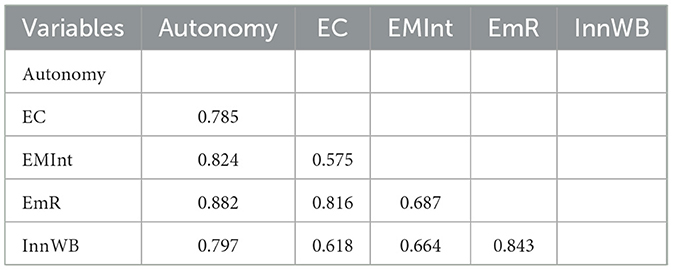 This study assessed the Fornell–Larcker ratio to test discriminant validity (Fornell and Larcker, 1981). According to Table 4, the Fornell and Larcker test values exceed the correlations between the variables.