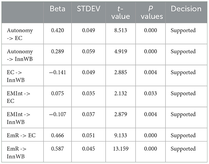 After validating the measurement model, the structural model was assessed to examine underlying relationships (Figure 3). The model's fit was evaluated using the standardized root mean square residual (SRMR), which should be below 0.08 for samples exceeding 100 (Henseler et al., 2009). This study demonstrated a significant model fit (0.042). Endogenous latent variables with coefficients of determination (R2) of 0.662 and 0.628 can be categorized as substantial (Hair et al., 2010, 2019b). Figure 2 indicates R2 (Creativity) = 0.628 and R2 (Innovation) = 0.662, suggesting the structural model possessed satisfactory in-sample predictive power, aligning with previous research in this field (Yesuf et al., 2023). Additionally, the Q2 value should exceed zero (Creativity = 0.620) and (Innovation = 0.649). The findings of this research fell within the significance threshold, confirming the model's predictive validity (Falk and Miller, 1992). Additionally, the researchers assessed the magnitude and significance of the path coefficients that represent the hypotheses. To determine the significance of these coefficients, they employed a bootstrapping technique (utilizing 5,000 samples). The outcomes of the structural model are depicted in Figure 2. A comprehensive overview of the path coefficients, along with their standard deviations, t-statistics, and p-values, is presented in Table 7.