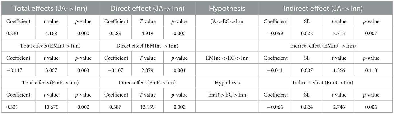 In terms of mediating effects, there was a significant indirect effects of employee resilience on employee innovation (β = −0.066, t = 2.746, p = 0.006) via employee creativity. Therefore, it was concluded that employee creativity partially mediated the relationships between employee resilience and employee innovation. Thus, H9 was supported. Further, the results indicated a significant indirect effects of job autonomy on employee innovation through employee creativity (β = −0.059, t = 2.715, p = 0.007), which shows partial mediator in the model (Table 8). Thus, H10 was supported. However, the results showed no indirect effects of emotional intelligence via employee creativity on employee innovation (β = −0.011, t = 1.566, p = 0.118). Hence, H8 was not supported.