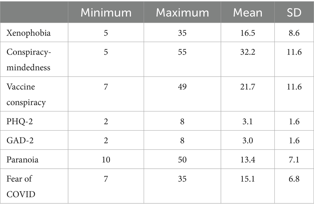 Descriptive statistics for the non-demographic variables are presented in Table 1. Xenophobia scores showed statistically significant bivariate Pearson correlations with several other measures (the Bonferroni-corrected alpha for each test was p = 0.0024). These included correlations of moderate strength with general conspiracy-mindedness (r = 0.298, p < 0.0005) and especially with specific vaccine conspiracy beliefs (r = 0.476, p < 0.0005) and relatively lower correlations with paranoia (r = 0.219, p < 0.0005) and fear of COVID (r = 0.154, p = 0.001) (Table 2). Correlations between xenophobia and symptoms were generally lower and significant for paranoia and fear of COVID infection, whereas the correlations between anxiety and depression did not survive Bonferroni correction for multiple comparisons.
