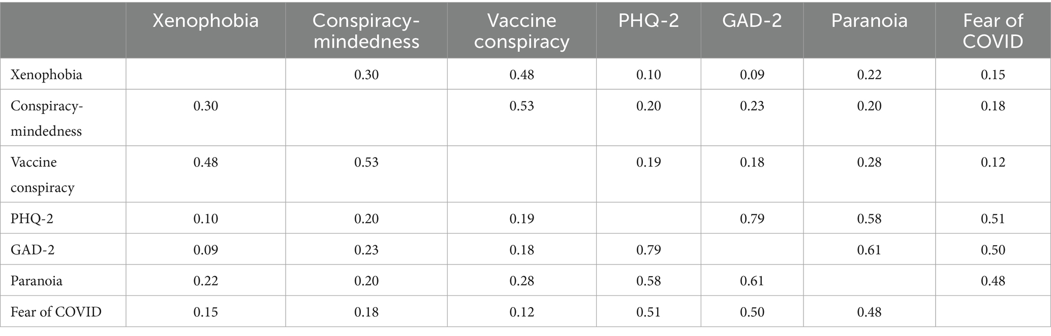 Table 2. Bivariate correlations (Pearson’s r) between xenophobia, conspiratorial belief, and symptom measures (all tabled p values < 0.001 uncorrected, except for xenophobia with PHQ-2 [p = 0.018] and GAD-2 [p = 0.036]).
