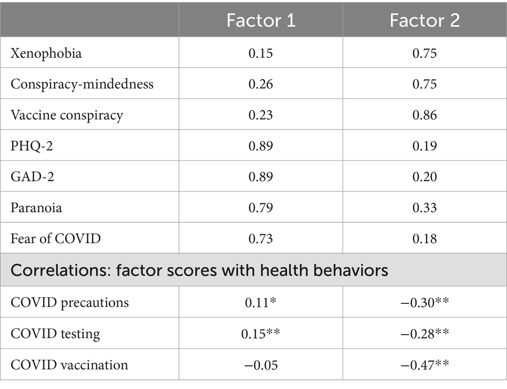 Table 3. Factor loadings of seven measures from exploratory factor analysis and bivariate correlations of factor scores with pandemic health behaviors (* p < 0.05, ** p < 0.001).