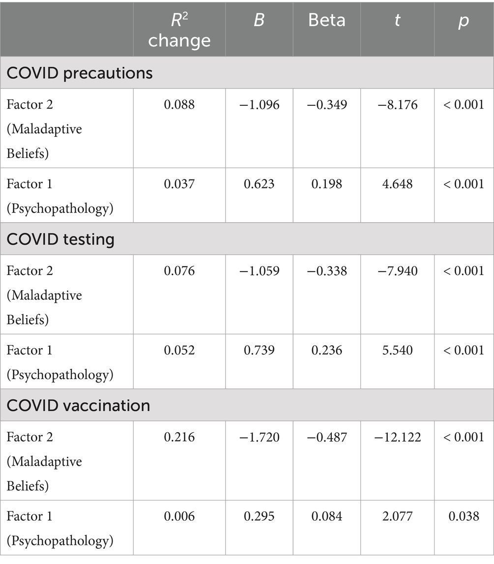 The regression model of COVID precautions was highly statistically significant (R2 = 0.124, F = 36.7, df 2, 517, p < 0.001). Both Factor 1 (Psychopathology) and Factor 2 were significant predictors of precautions (both p < 0.001; Table 4). The regression model of COVID Testing was highly statistically significant (R2 = 0.128, F = 37.5, df 2, 517, p < 0.001). Both Factor 1 (Psychopathology) and Factor 2 were significant predictors of testing (both p < 0.001; Table 4). The regression model of COVID vaccination was highly statistically significant (R2 = 0.223, F = 74.18, df 2, 517, p < 0.001). Both Factor 1 (Psychopathology) and Factor 2 were significant predictors of vaccination (Factor 1, p = 0.038 and Factor 2, p < 0.001; Table 4). In each regression model, Factor 2 (Maladaptive Beliefs) contributed a larger share of variance in pandemic-related health behaviors, especially for vaccination.
