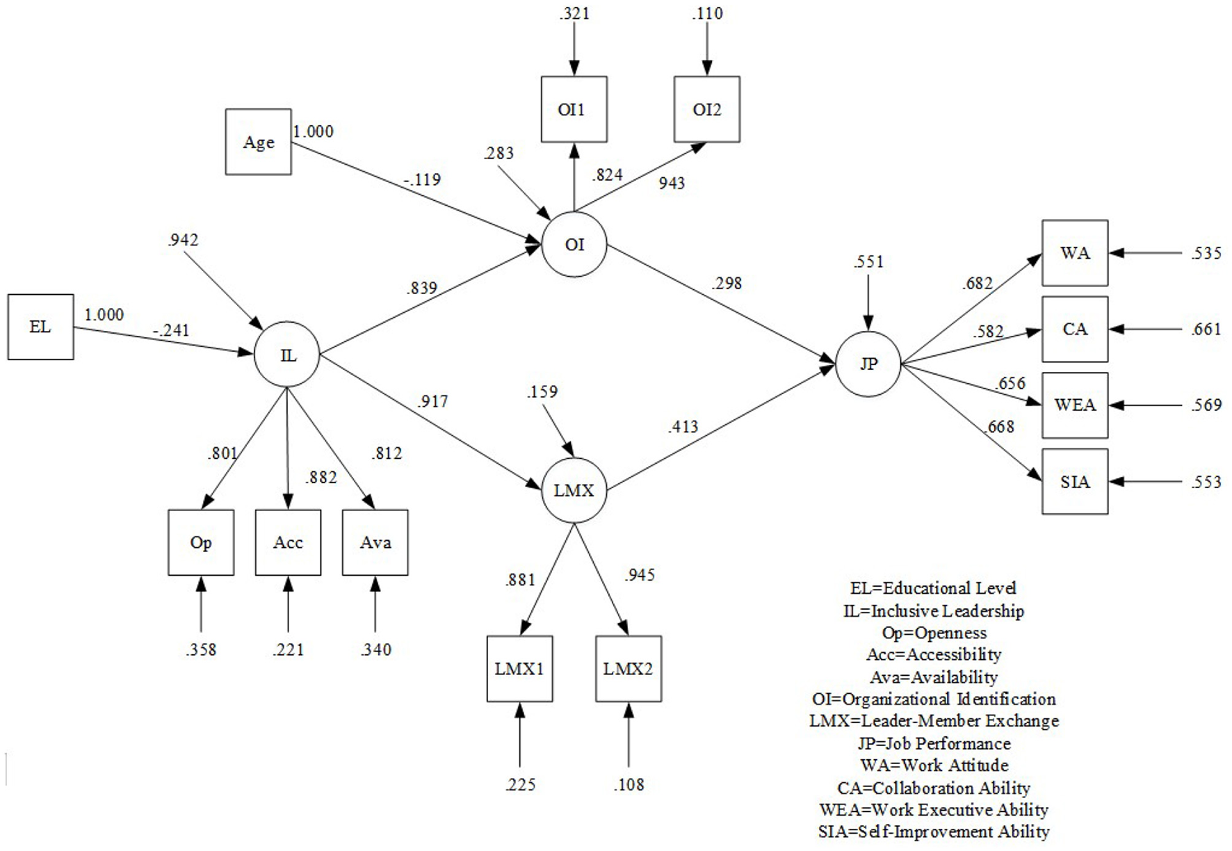 The results revealed that inclusive leadership is positively associated with job performance, leader-member exchange, and organizational identification. A hierarchical regression and bootstrap analysis indicated that organizational identification and leader-member exchange significantly mediated the relationship between inclusive leadership and job performance, and the structural equation model supported the results.