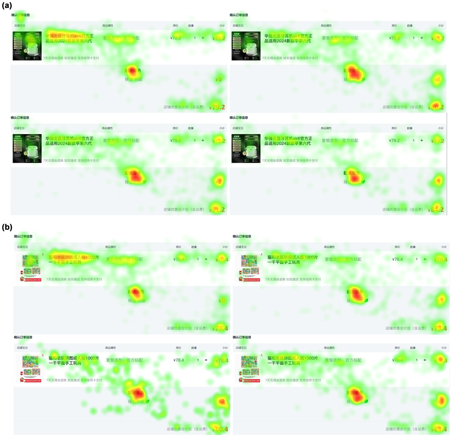 Heatmap of the checkout interface AOI for different product types. (a) Search products. (b) Experience products.