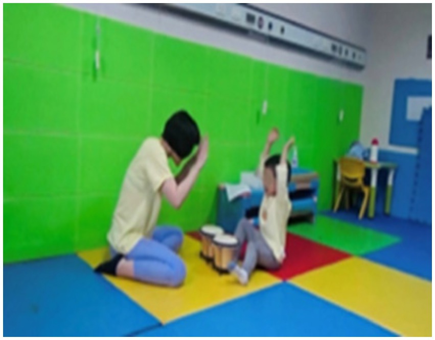 The first video was a game about body numbers. My child followed you to identify the numbers. In the second video, you played the drums together, and my child imitated your movements, with your rhythms matching each other. These images are very heartwarming, and he was willing to follow you as the therapist, which means he was focused on participating in the current activity (see Figures 3, 4).